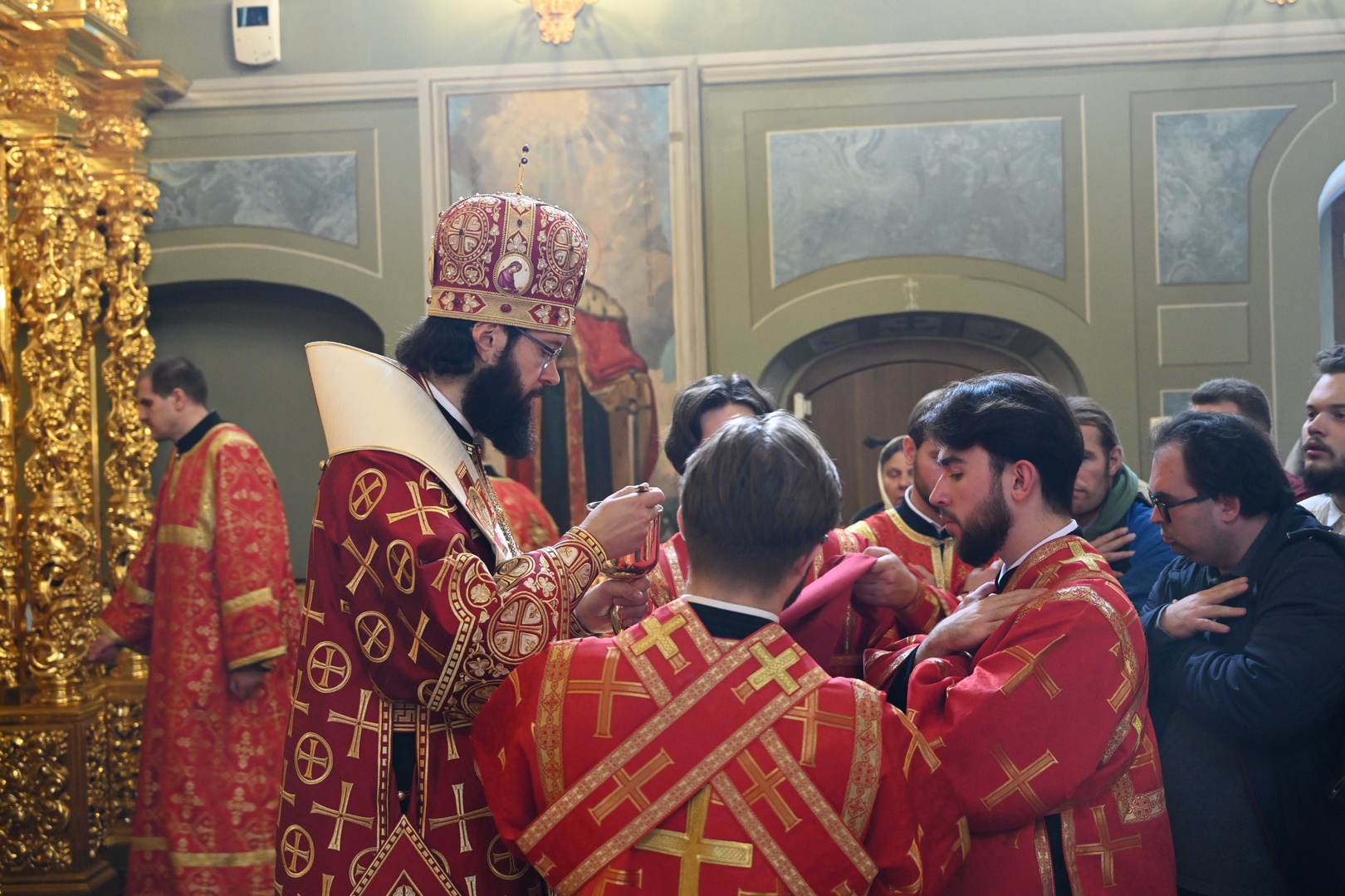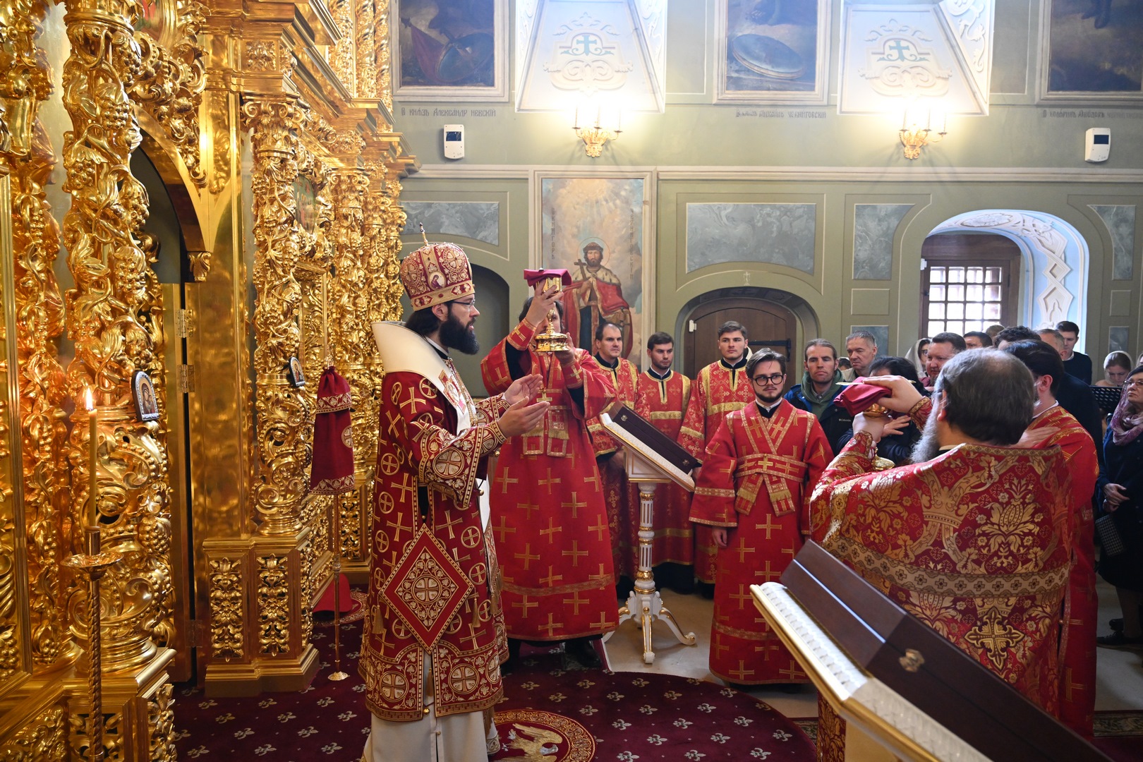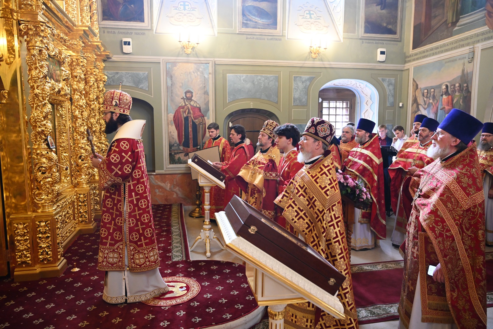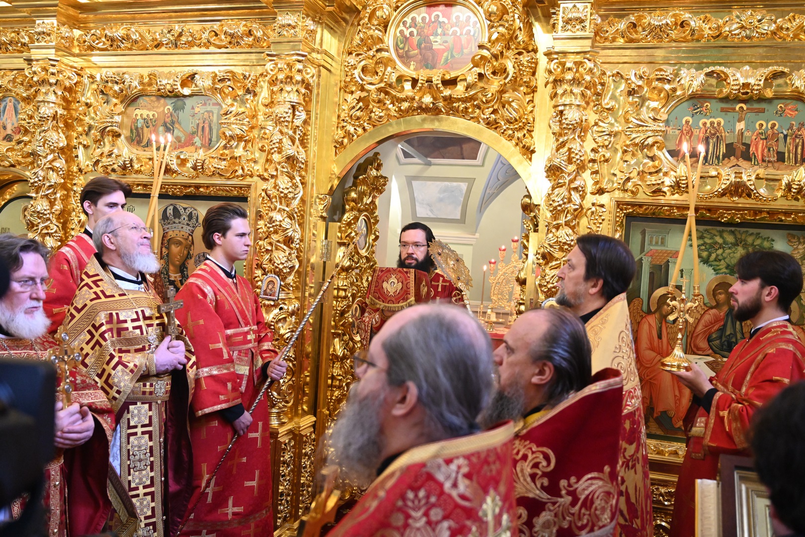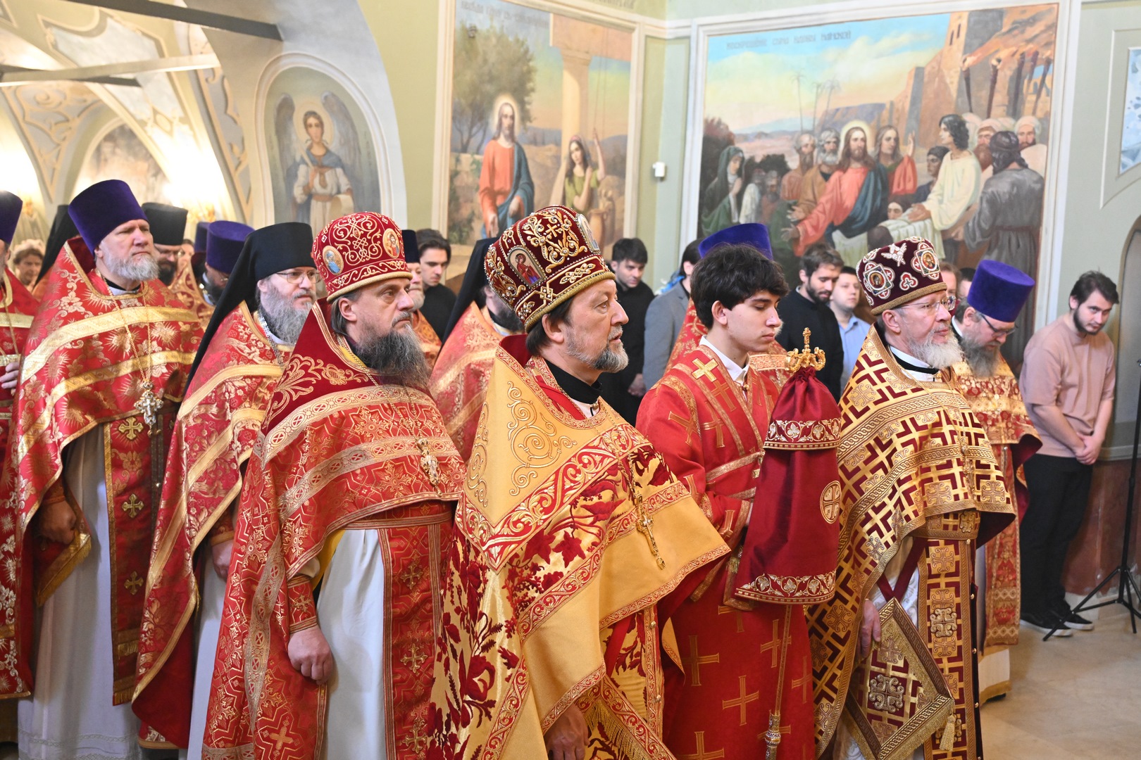 Высокопреосвященнейшему Владыке сослужили: протоиерей Максим Козлов, председатель Учебного комитета Русской Православной Церкви, ректор Общецерковной аспирантуры и докторантуры, настоятель Патриаршего Черниговского подворья; протоиерей Николай Балашов, советник Патриарха Московского и всея Руси, настоятель храма Воскресения Словущего на Успенском вражке; архимандрит Афанасий (Соколов), ректор Минской духовной академии; игумен Иоанн (Лудищев), ректор Сретенской духовной академии; игумен Дионисий (Шленов), наместник Андреевского ставропигиального монастыря г. Москвы; протоиерей Сергий Селезнев, благочинный Москворецкого церковного округа г. Москвы, настоятель храма Архангела Михаила в Овчинниках; протоиерей Игорь Выжанов, заместитель председателя ОВЦС, настоятель храма в честь иконы Божией Матери «Всех скорбящих Радость» на Большой Ордынке г. Москвы; иеромонах Лука (Пронских), и.о. ректора Николо-Угрешской духовной семинарии; иерей Дмитрий Гамиловский, ректор Смоленской духовной семинарии; иеромонах Андрей (Коротков), ректор Таврической духовной семинарии; протоиерей Алексий Марченко, начальник отдела докторантуры ОЦАД, и.о. настоятеля храма священномученика Климента папы Римского в Замоскворечье; иерей Павел Лизгунов, проректор по учебной работе Московской духовной академии; иеромонах Мелитон (Павлов), проректор по воспитательной работе Санкт-Петербургской духовной академии; иеромонах Ириней (Пиковский), и.о. проректора по научно-богословской работе Сретенской духовной академии; протоиерей Андрей Милкин, настоятель храма святого великомученика Димитрия Солунского на Благуше; протоиерей Сергий Звонарев, настоятель храма святых мучеников и страстотерпцев Бориса и Глеба в Зюзине; иерей Михаил Желтов, настоятель храма Рождества Христова в Митино; иерей Илия Соловьев, клирик храма Живоначальной Троицы в с. Дьячево; иерей Дмитрий Данилов, ответственный за работу с вузами и научным сообществом Центрального викариатства; иеродиакон Тихон (Кусов), начальник учебно-методического отдела Сретенской духовной академии, а также клирики Черниговского подворья и сотрудники Общецерковной аспирантуры и докторантуры в священном сане.