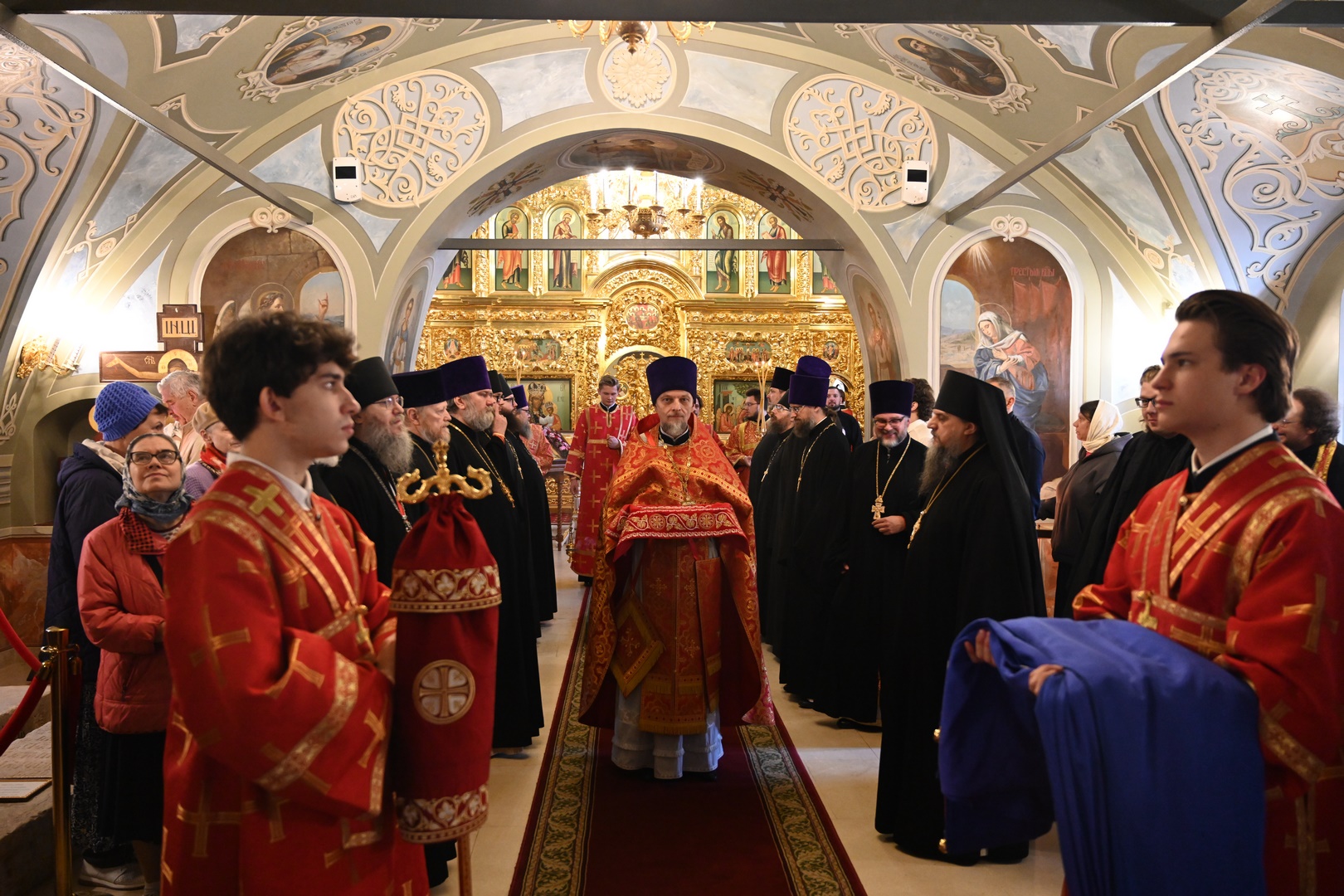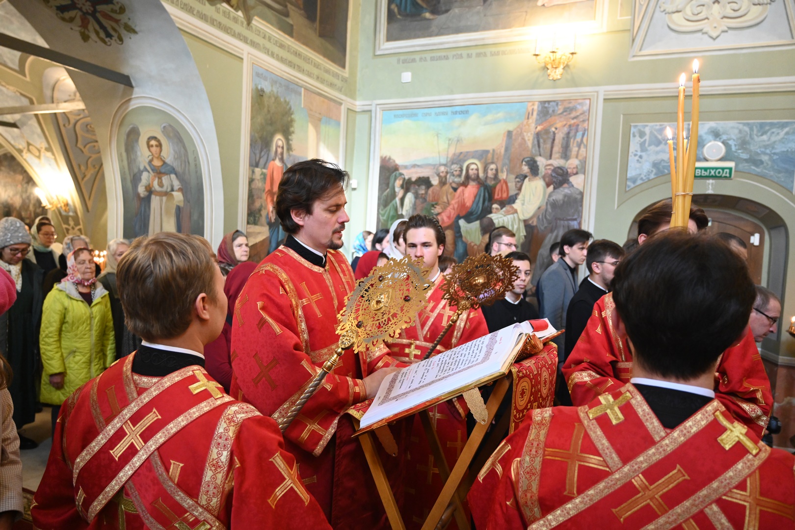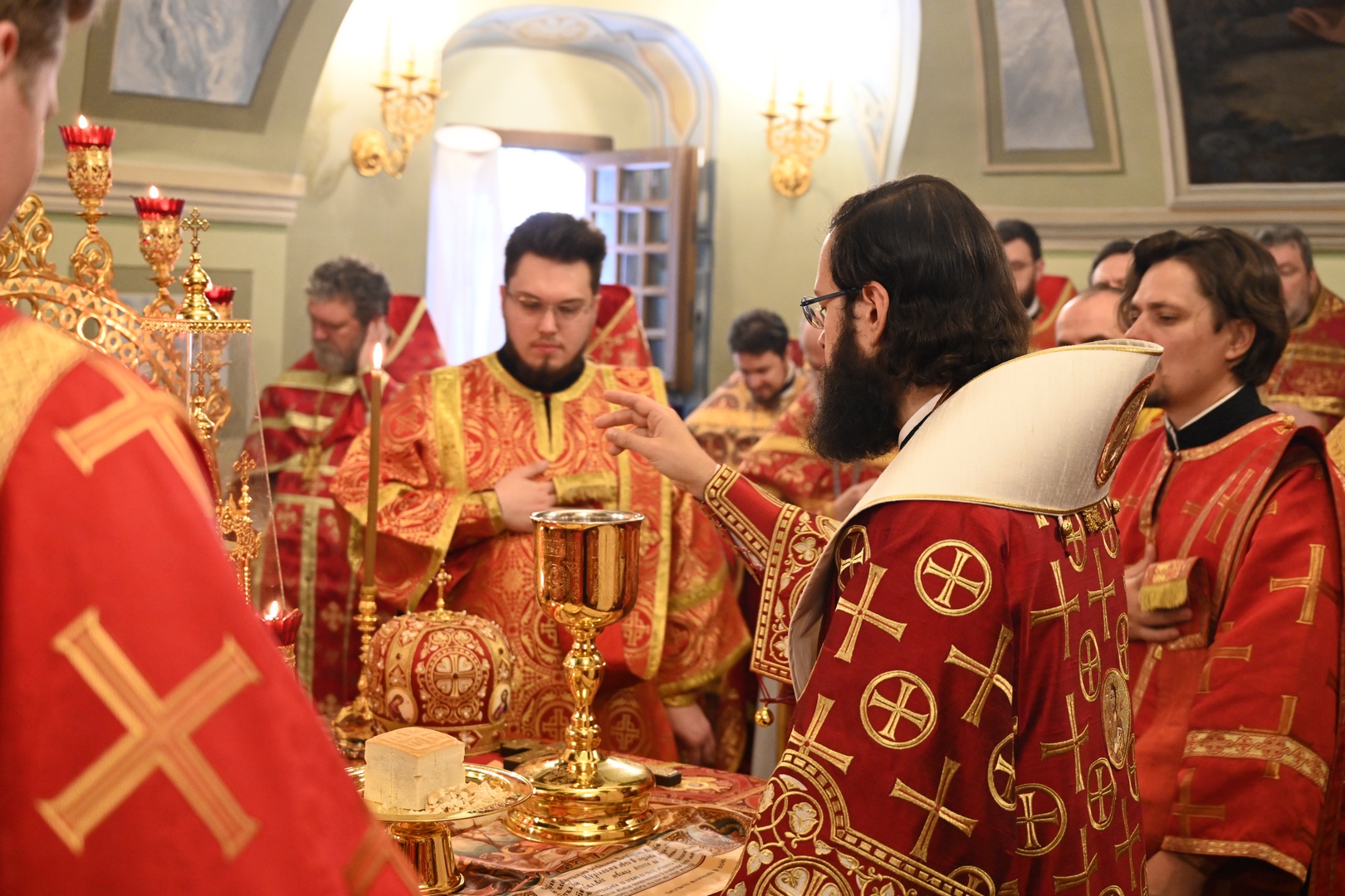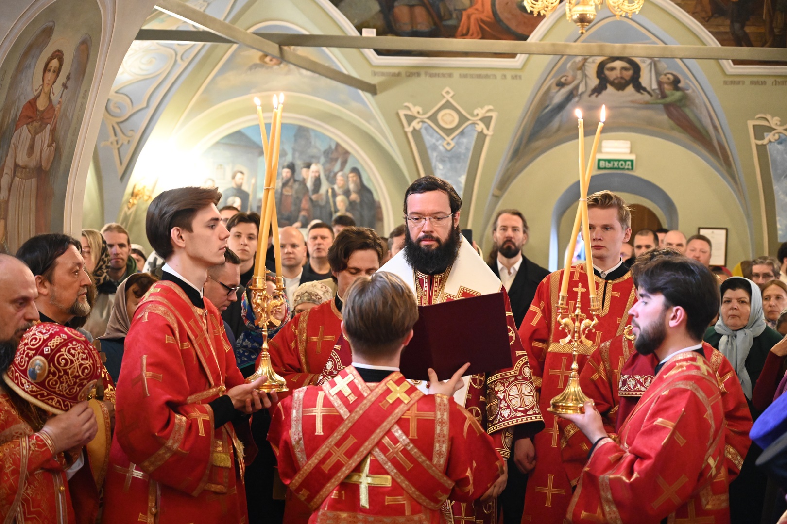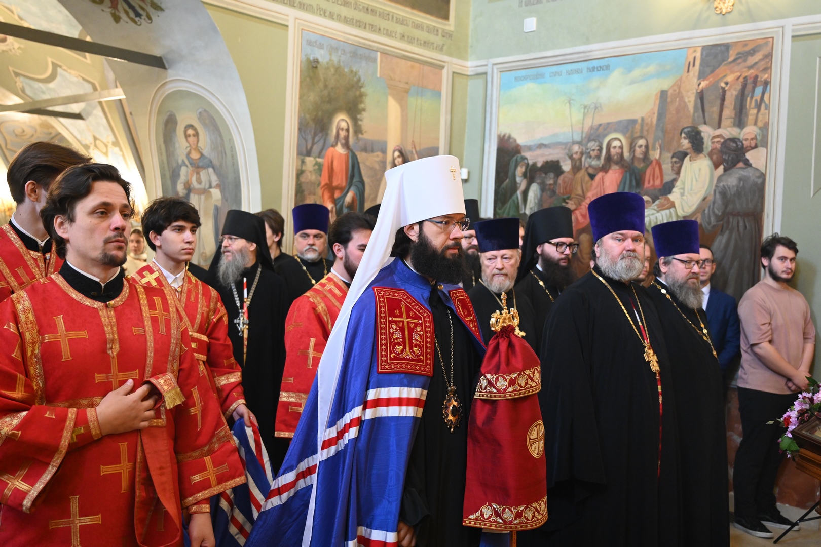 Высокопреосвященнейшему Владыке сослужили: протоиерей Максим Козлов, председатель Учебного комитета Русской Православной Церкви, ректор Общецерковной аспирантуры и докторантуры, настоятель Патриаршего Черниговского подворья; протоиерей Николай Балашов, советник Патриарха Московского и всея Руси, настоятель храма Воскресения Словущего на Успенском вражке; архимандрит Афанасий (Соколов), ректор Минской духовной академии; игумен Иоанн (Лудищев), ректор Сретенской духовной академии; игумен Дионисий (Шленов), наместник Андреевского ставропигиального монастыря г. Москвы; протоиерей Сергий Селезнев, благочинный Москворецкого церковного округа г. Москвы, настоятель храма Архангела Михаила в Овчинниках; протоиерей Игорь Выжанов, заместитель председателя ОВЦС, настоятель храма в честь иконы Божией Матери «Всех скорбящих Радость» на Большой Ордынке г. Москвы; иеромонах Лука (Пронских), и.о. ректора Николо-Угрешской духовной семинарии; иерей Дмитрий Гамиловский, ректор Смоленской духовной семинарии; иеромонах Андрей (Коротков), ректор Таврической духовной семинарии; протоиерей Алексий Марченко, начальник отдела докторантуры ОЦАД, и.о. настоятеля храма священномученика Климента папы Римского в Замоскворечье; иерей Павел Лизгунов, проректор по учебной работе Московской духовной академии; иеромонах Мелитон (Павлов), проректор по воспитательной работе Санкт-Петербургской духовной академии; иеромонах Ириней (Пиковский), и.о. проректора по научно-богословской работе Сретенской духовной академии; протоиерей Андрей Милкин, настоятель храма святого великомученика Димитрия Солунского на Благуше; протоиерей Сергий Звонарев, настоятель храма святых мучеников и страстотерпцев Бориса и Глеба в Зюзине; иерей Михаил Желтов, настоятель храма Рождества Христова в Митино; иерей Илия Соловьев, клирик храма Живоначальной Троицы в с. Дьячево; иерей Дмитрий Данилов, ответственный за работу с вузами и научным сообществом Центрального викариатства; иеродиакон Тихон (Кусов), начальник учебно-методического отдела Сретенской духовной академии, а также клирики Черниговского подворья и сотрудники Общецерковной аспирантуры и докторантуры в священном сане.