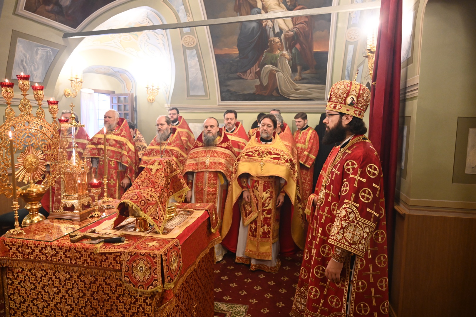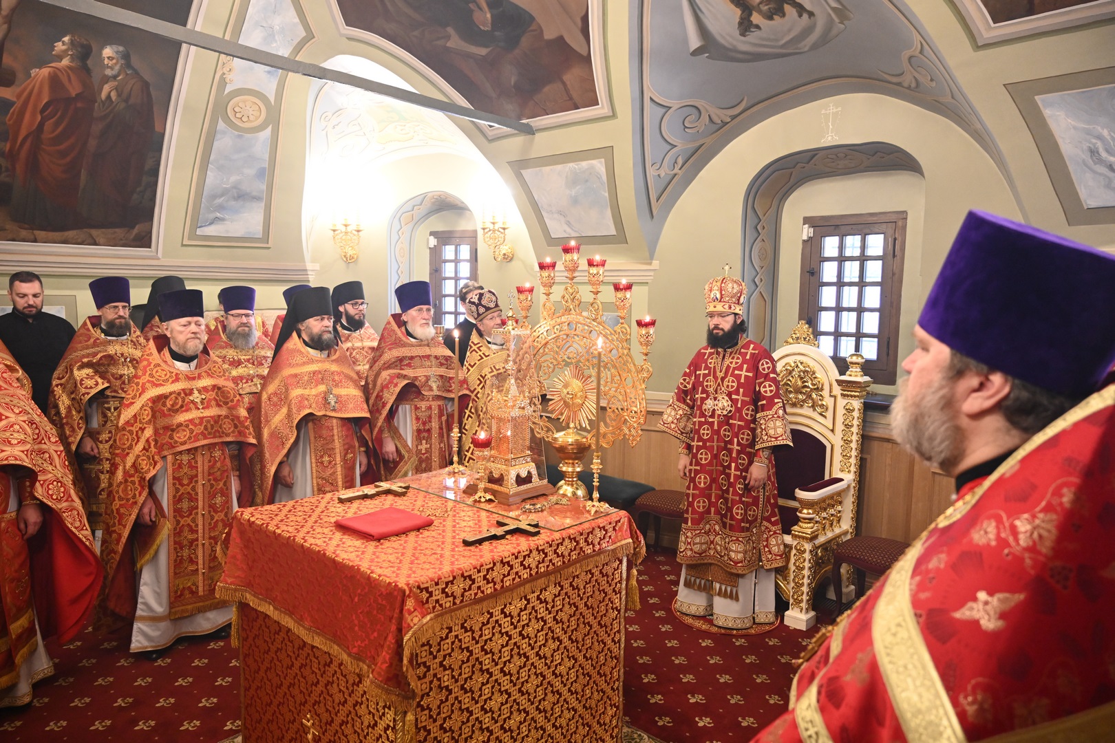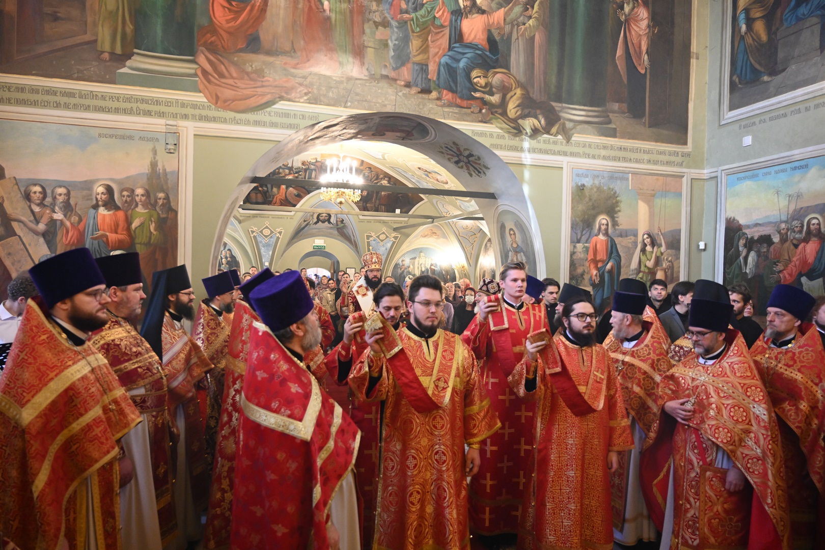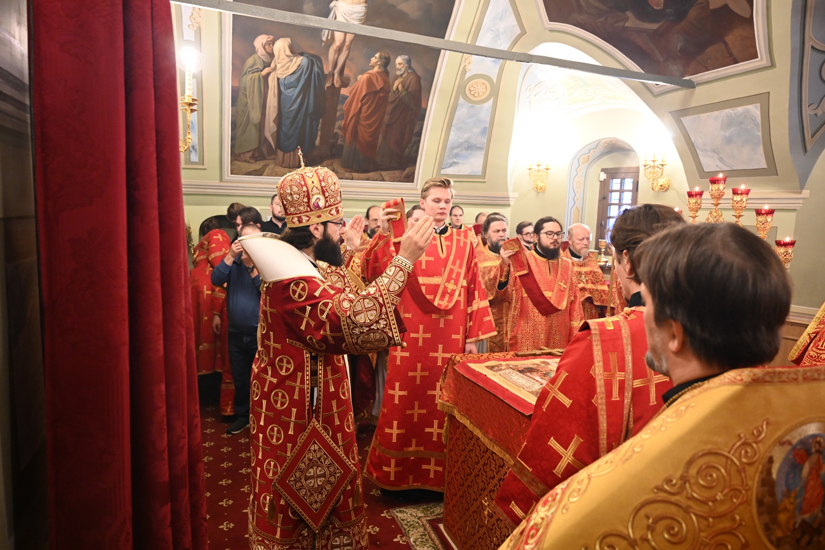 Высокопреосвященнейшему Владыке сослужили: протоиерей Максим Козлов, председатель Учебного комитета Русской Православной Церкви, ректор Общецерковной аспирантуры и докторантуры, настоятель Патриаршего Черниговского подворья; протоиерей Николай Балашов, советник Патриарха Московского и всея Руси, настоятель храма Воскресения Словущего на Успенском вражке; архимандрит Афанасий (Соколов), ректор Минской духовной академии; игумен Иоанн (Лудищев), ректор Сретенской духовной академии; игумен Дионисий (Шленов), наместник Андреевского ставропигиального монастыря г. Москвы; протоиерей Сергий Селезнев, благочинный Москворецкого церковного округа г. Москвы, настоятель храма Архангела Михаила в Овчинниках; протоиерей Игорь Выжанов, заместитель председателя ОВЦС, настоятель храма в честь иконы Божией Матери «Всех скорбящих Радость» на Большой Ордынке г. Москвы; иеромонах Лука (Пронских), и.о. ректора Николо-Угрешской духовной семинарии; иерей Дмитрий Гамиловский, ректор Смоленской духовной семинарии; иеромонах Андрей (Коротков), ректор Таврической духовной семинарии; протоиерей Алексий Марченко, начальник отдела докторантуры ОЦАД, и.о. настоятеля храма священномученика Климента папы Римского в Замоскворечье; иерей Павел Лизгунов, проректор по учебной работе Московской духовной академии; иеромонах Мелитон (Павлов), проректор по воспитательной работе Санкт-Петербургской духовной академии; иеромонах Ириней (Пиковский), и.о. проректора по научно-богословской работе Сретенской духовной академии; протоиерей Андрей Милкин, настоятель храма святого великомученика Димитрия Солунского на Благуше; протоиерей Сергий Звонарев, настоятель храма святых мучеников и страстотерпцев Бориса и Глеба в Зюзине; иерей Михаил Желтов, настоятель храма Рождества Христова в Митино; иерей Илия Соловьев, клирик храма Живоначальной Троицы в с. Дьячево; иерей Дмитрий Данилов, ответственный за работу с вузами и научным сообществом Центрального викариатства; иеродиакон Тихон (Кусов), начальник учебно-методического отдела Сретенской духовной академии, а также клирики Черниговского подворья и сотрудники Общецерковной аспирантуры и докторантуры в священном сане.