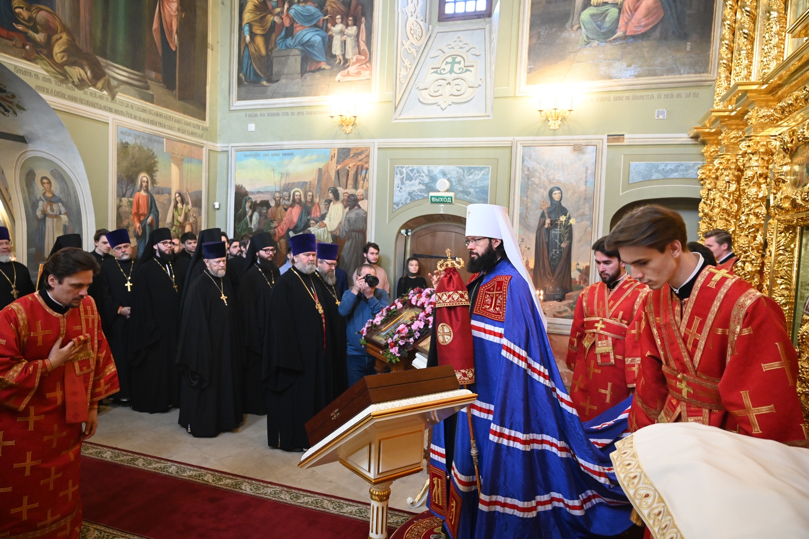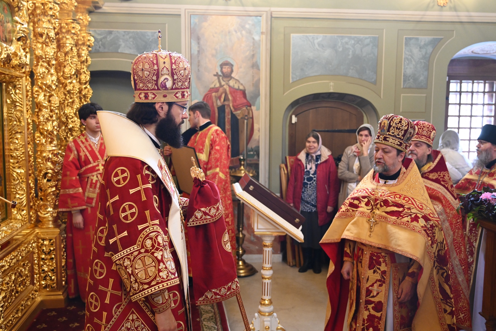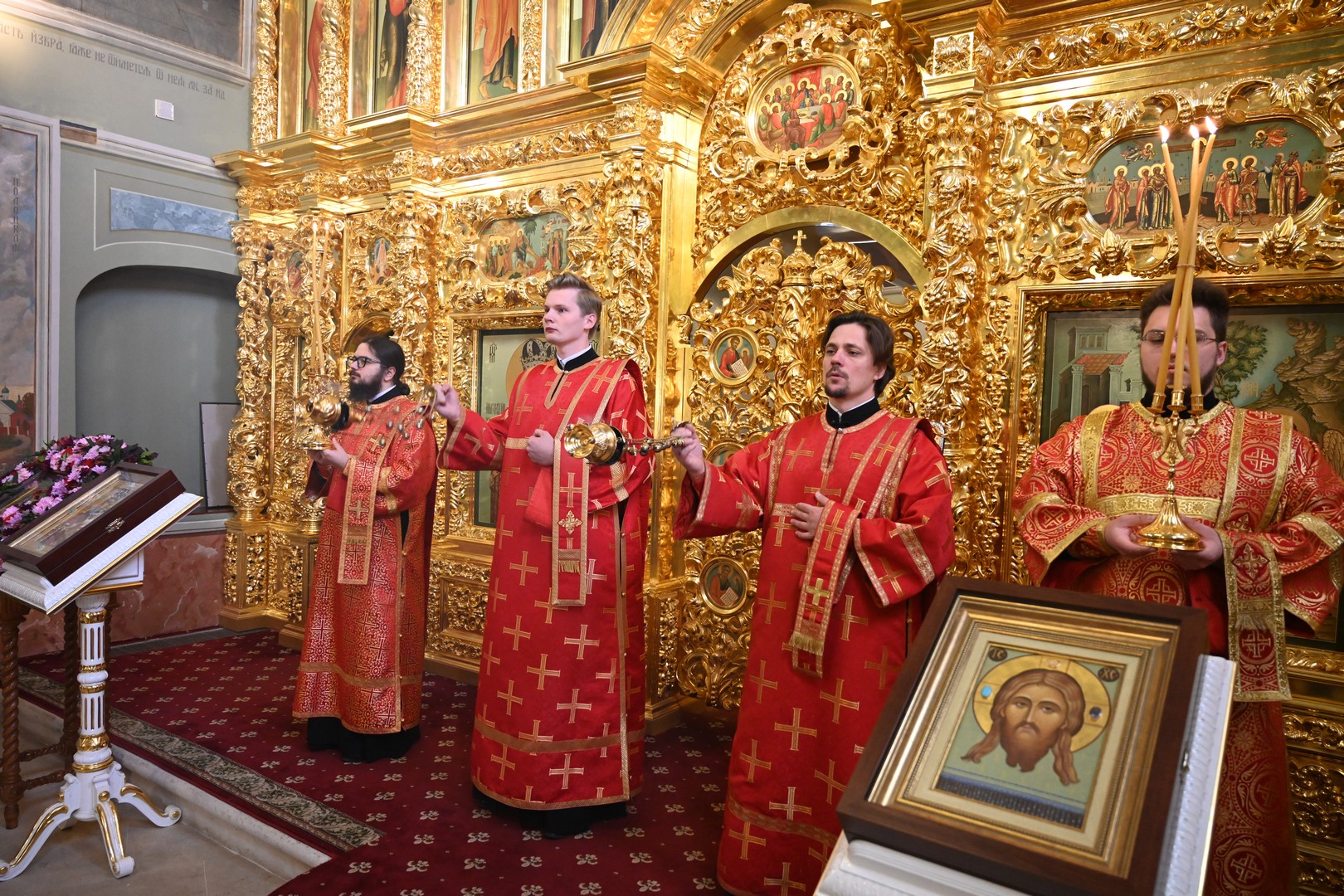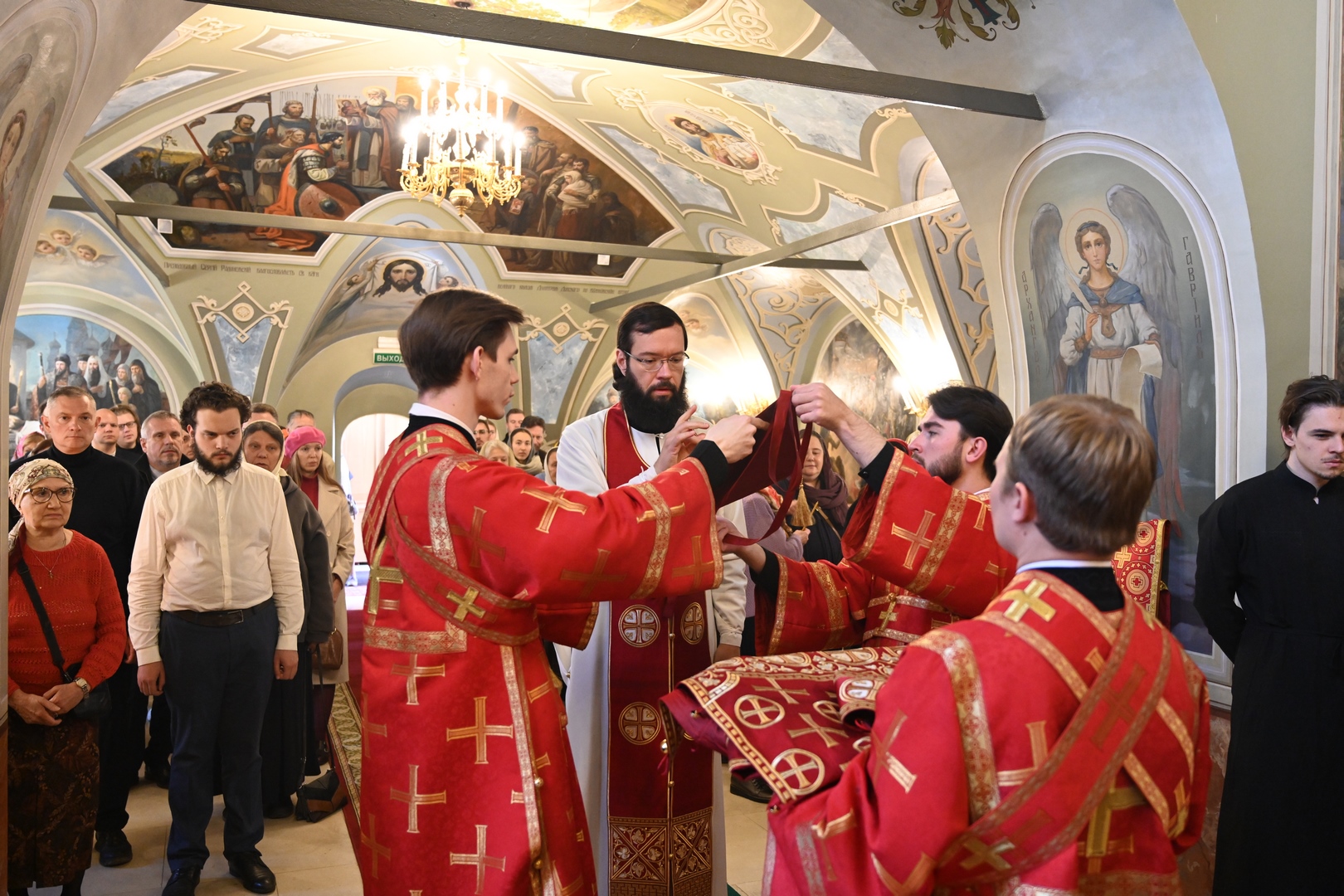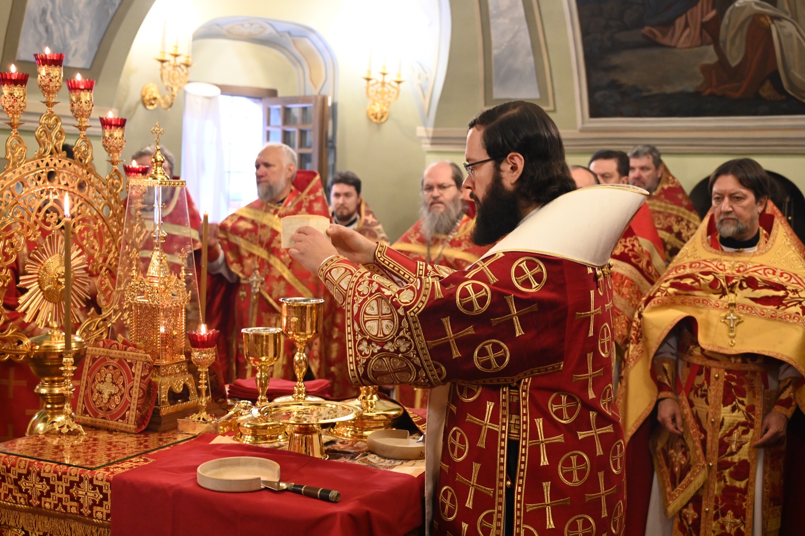 Высокопреосвященнейшему Владыке сослужили: протоиерей Максим Козлов, председатель Учебного комитета Русской Православной Церкви, ректор Общецерковной аспирантуры и докторантуры, настоятель Патриаршего Черниговского подворья; протоиерей Николай Балашов, советник Патриарха Московского и всея Руси, настоятель храма Воскресения Словущего на Успенском вражке; архимандрит Афанасий (Соколов), ректор Минской духовной академии; игумен Иоанн (Лудищев), ректор Сретенской духовной академии; игумен Дионисий (Шленов), наместник Андреевского ставропигиального монастыря г. Москвы; протоиерей Сергий Селезнев, благочинный Москворецкого церковного округа г. Москвы, настоятель храма Архангела Михаила в Овчинниках; протоиерей Игорь Выжанов, заместитель председателя ОВЦС, настоятель храма в честь иконы Божией Матери «Всех скорбящих Радость» на Большой Ордынке г. Москвы; иеромонах Лука (Пронских), и.о. ректора Николо-Угрешской духовной семинарии; иерей Дмитрий Гамиловский, ректор Смоленской духовной семинарии; иеромонах Андрей (Коротков), ректор Таврической духовной семинарии; протоиерей Алексий Марченко, начальник отдела докторантуры ОЦАД, и.о. настоятеля храма священномученика Климента папы Римского в Замоскворечье; иерей Павел Лизгунов, проректор по учебной работе Московской духовной академии; иеромонах Мелитон (Павлов), проректор по воспитательной работе Санкт-Петербургской духовной академии; иеромонах Ириней (Пиковский), и.о. проректора по научно-богословской работе Сретенской духовной академии; протоиерей Андрей Милкин, настоятель храма святого великомученика Димитрия Солунского на Благуше; протоиерей Сергий Звонарев, настоятель храма святых мучеников и страстотерпцев Бориса и Глеба в Зюзине; иерей Михаил Желтов, настоятель храма Рождества Христова в Митино; иерей Илия Соловьев, клирик храма Живоначальной Троицы в с. Дьячево; иерей Дмитрий Данилов, ответственный за работу с вузами и научным сообществом Центрального викариатства; иеродиакон Тихон (Кусов), начальник учебно-методического отдела Сретенской духовной академии, а также клирики Черниговского подворья и сотрудники Общецерковной аспирантуры и докторантуры в священном сане.