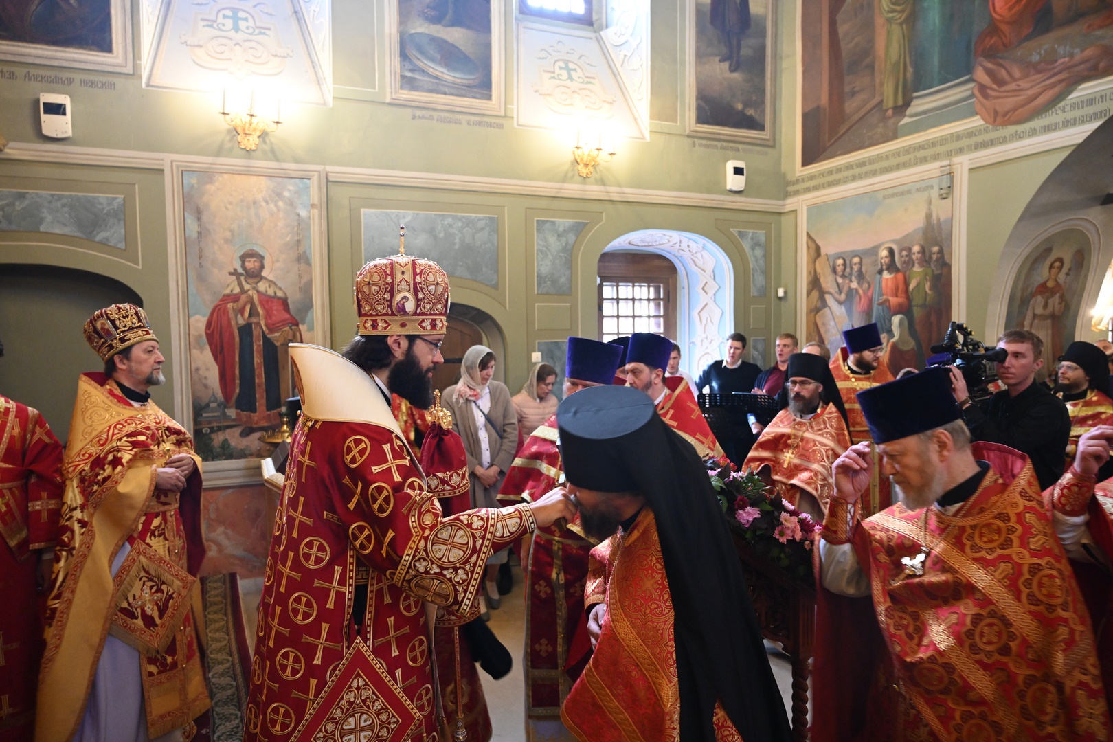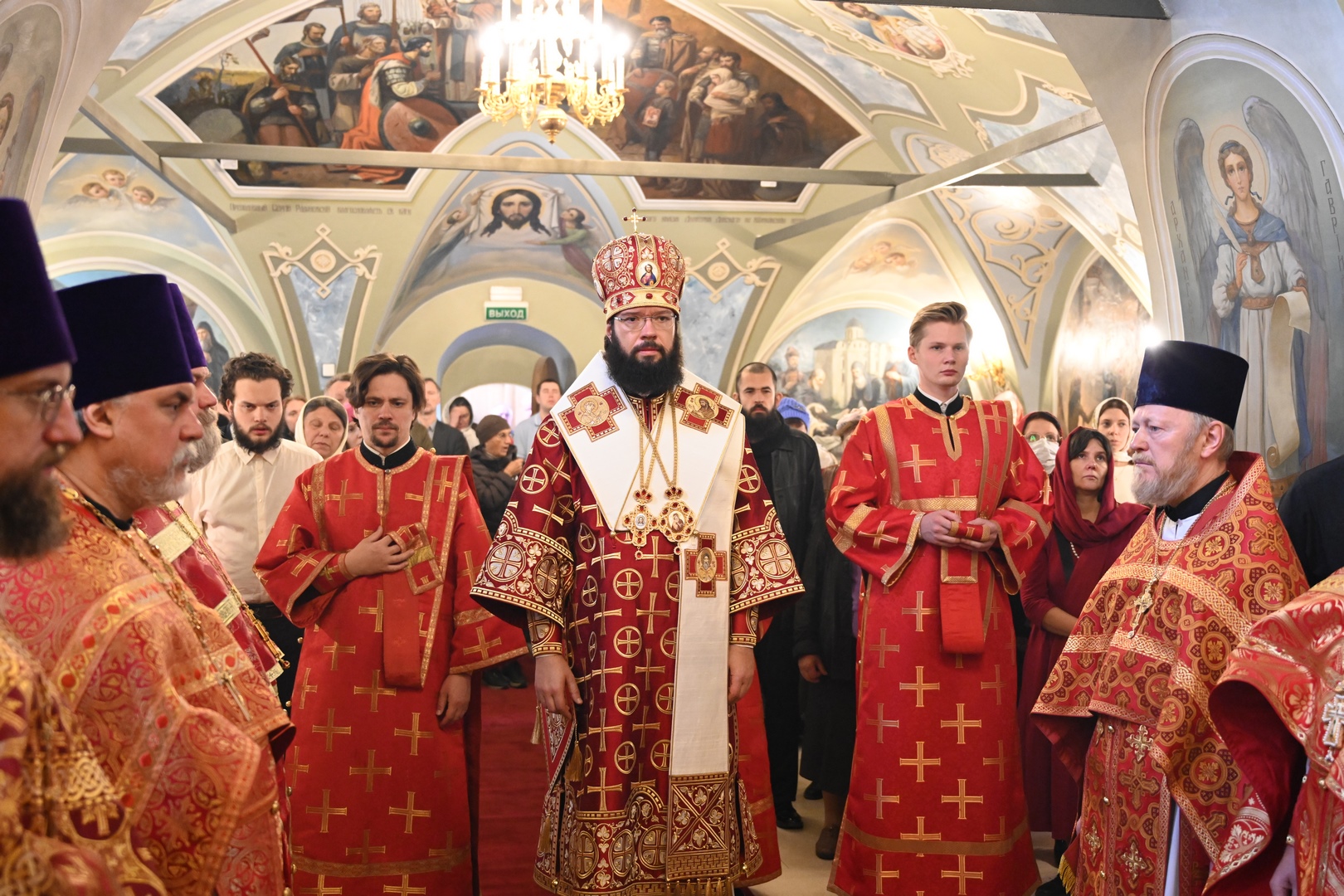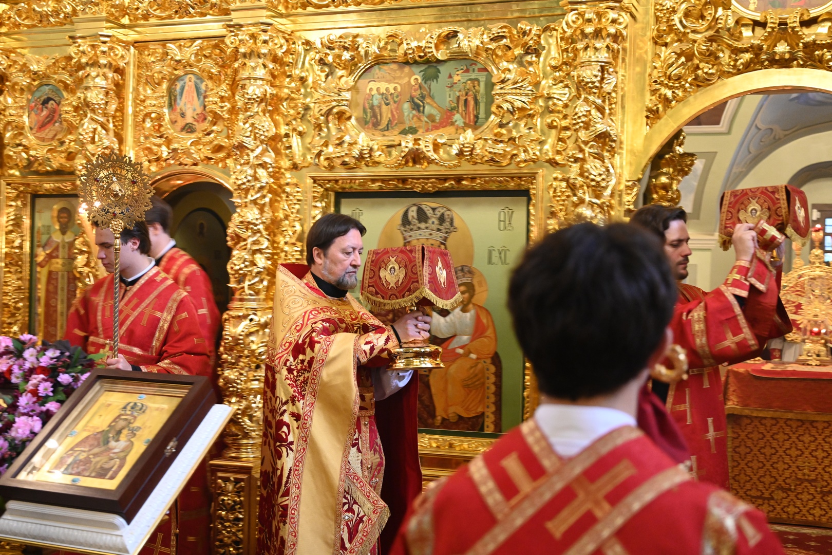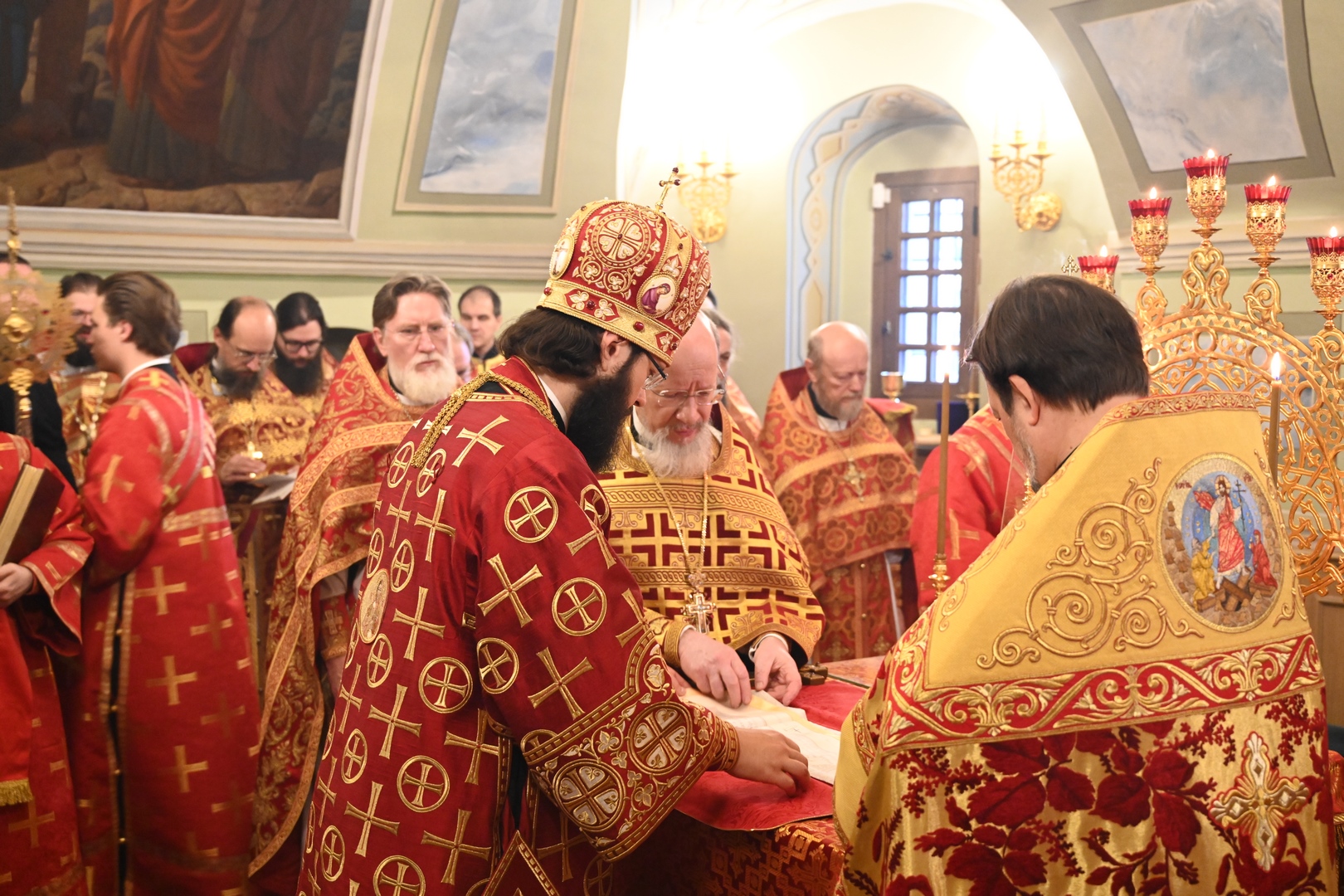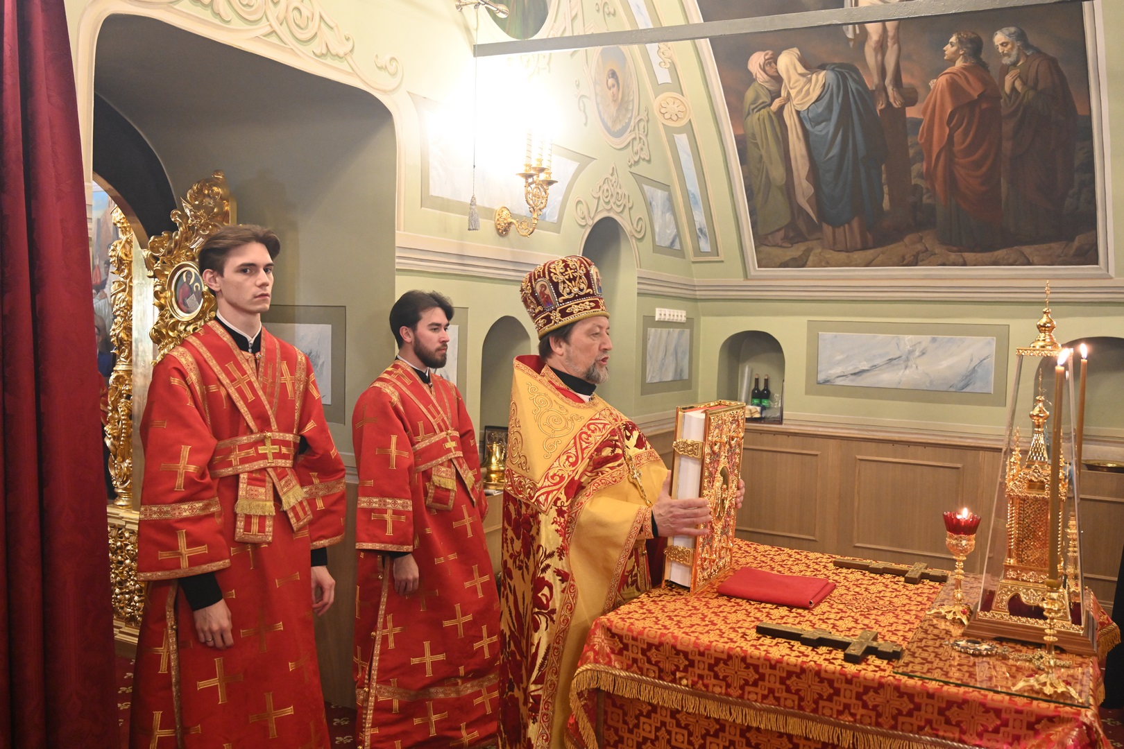 Высокопреосвященнейшему Владыке сослужили: протоиерей Максим Козлов, председатель Учебного комитета Русской Православной Церкви, ректор Общецерковной аспирантуры и докторантуры, настоятель Патриаршего Черниговского подворья; протоиерей Николай Балашов, советник Патриарха Московского и всея Руси, настоятель храма Воскресения Словущего на Успенском вражке; архимандрит Афанасий (Соколов), ректор Минской духовной академии; игумен Иоанн (Лудищев), ректор Сретенской духовной академии; игумен Дионисий (Шленов), наместник Андреевского ставропигиального монастыря г. Москвы; протоиерей Сергий Селезнев, благочинный Москворецкого церковного округа г. Москвы, настоятель храма Архангела Михаила в Овчинниках; протоиерей Игорь Выжанов, заместитель председателя ОВЦС, настоятель храма в честь иконы Божией Матери «Всех скорбящих Радость» на Большой Ордынке г. Москвы; иеромонах Лука (Пронских), и.о. ректора Николо-Угрешской духовной семинарии; иерей Дмитрий Гамиловский, ректор Смоленской духовной семинарии; иеромонах Андрей (Коротков), ректор Таврической духовной семинарии; протоиерей Алексий Марченко, начальник отдела докторантуры ОЦАД, и.о. настоятеля храма священномученика Климента папы Римского в Замоскворечье; иерей Павел Лизгунов, проректор по учебной работе Московской духовной академии; иеромонах Мелитон (Павлов), проректор по воспитательной работе Санкт-Петербургской духовной академии; иеромонах Ириней (Пиковский), и.о. проректора по научно-богословской работе Сретенской духовной академии; протоиерей Андрей Милкин, настоятель храма святого великомученика Димитрия Солунского на Благуше; протоиерей Сергий Звонарев, настоятель храма святых мучеников и страстотерпцев Бориса и Глеба в Зюзине; иерей Михаил Желтов, настоятель храма Рождества Христова в Митино; иерей Илия Соловьев, клирик храма Живоначальной Троицы в с. Дьячево; иерей Дмитрий Данилов, ответственный за работу с вузами и научным сообществом Центрального викариатства; иеродиакон Тихон (Кусов), начальник учебно-методического отдела Сретенской духовной академии, а также клирики Черниговского подворья и сотрудники Общецерковной аспирантуры и докторантуры в священном сане.