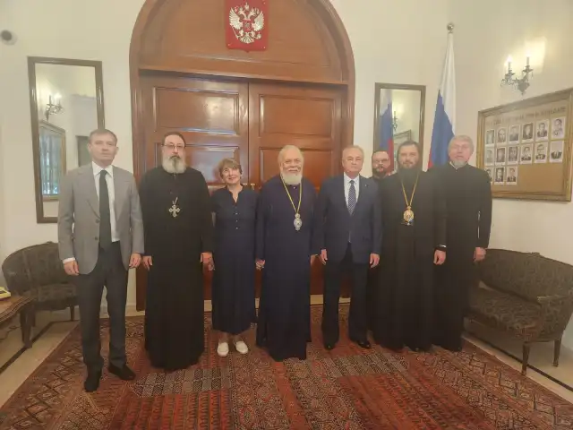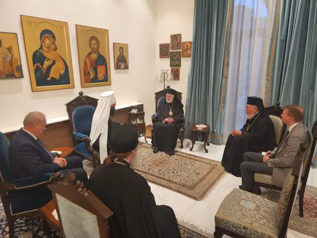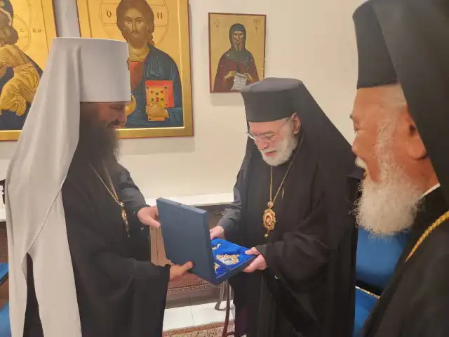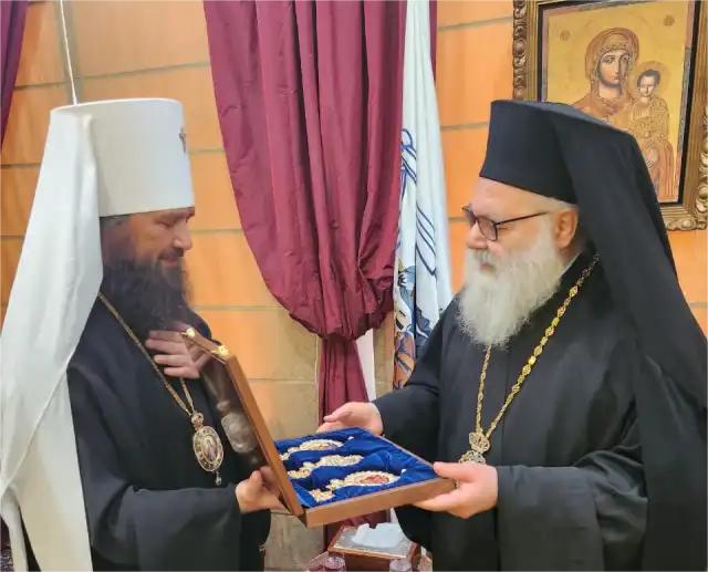 Митрополит Волгоградский и Камышинский Феодор передал Блаженнейшему Патриарху Иоанну братское приветствие от Святейшего Патриарха Кирилла и портфолио с проектом восстановления разрушенного храма в Сирии, в котором готова принять участие Русская Православная Церковь.