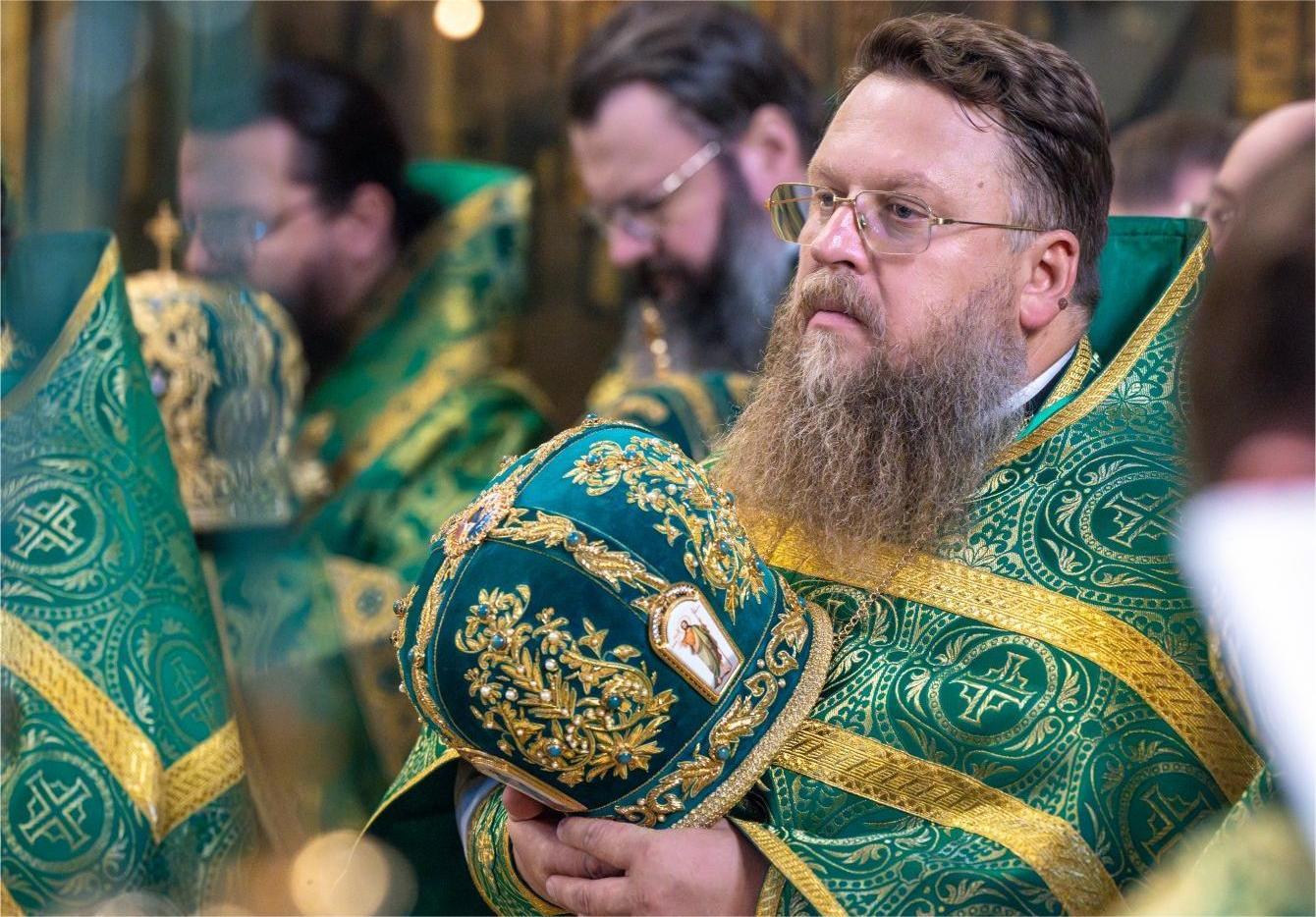 Епископ Сергиево-Посадский и Дмитровский Кирилл приветствовал Святейшего Владыку и преподнес Его Святейшеству памятную панагию.