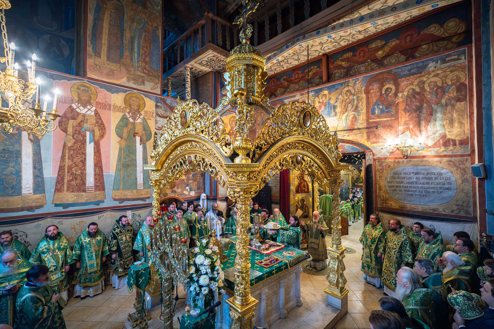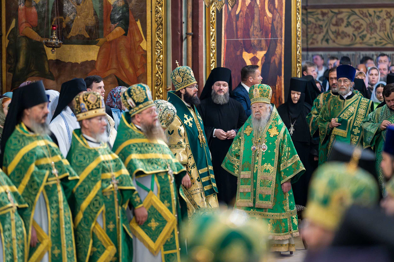 В соборе молились архиереи, настоятельницы женских монастырей, священнослужители, монашествующие и паломники, прибывшие на торжества в Троице-Сергиеву лавру.