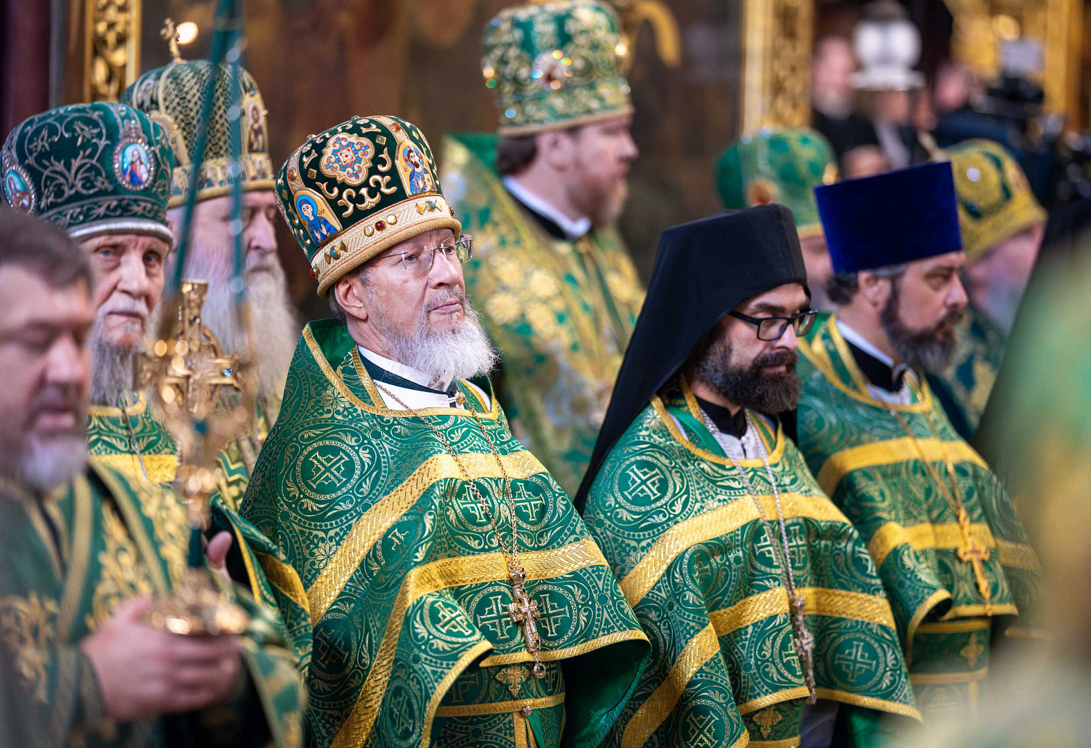 За Литургией Его Святейшеству сослужили: митрополит Ювеналий (Поярков); митрополит Воскресенский Григорий, управляющий делами Московской Патриархии, первый викарий Патриарха Московского и всея Руси по г. Москве; митрополит Волоколамский Антоний, председатель Отдела внешних церковных связей Московского Патриархата; митрополит Владимирский и Суздальский Никандр, председатель Финансово-хозяйственного управления Московского Патриархата; митрополит Липецкий и Задонский Арсений; митрополит Белгородский и Старооскольский Иоанн; митрополит Иваново-Вознесенский и Вичугский Иосиф; митрополит Каширский Феогност, председатель Синодального отдела по монастырям и монашеству; митрополит Нижегородский и Арзамасский Георгий; митрополит Луганский и Алчевский Пантелеимон; митрополит Донецкий и Мариупольский Владимир; митрополит Самарский и Новокуйбышевский Феодосий; митрополит Красноярский и Ачинский Никита; митрополит Смоленский и Дорогобужский Исидор; митрополит Псковский и Порховский Матфей; митрополит Звенигородский Арсений; митрополит Екатеринбургский и Верхотурский Евгений, председатель Синодального отдела религиозного образования и катехизации; архиепископ Одинцовский и Красногорский Фома, руководитель Административного секретариата Московской Патриархии; архиепископ Зеленоградский Савва, заместитель управляющего делами Московской Патриархии, председатель Синодального миссионерского отдела; епископ Павлово-Посадский Силуан, заместитель управляющего делами Московской Патриархии; епископ Норильский и Туруханский Агафангел; епископ Истринский Серафим, председатель Синодального молодежного отдела; епископ Джанкойский и Раздольненский Алексий; епископ Сергиево-Посадский и Дмитровский Кирилл; епископ Ноябрьский Феодосий; епископ Троицкий и Южноуральский Павел; епископ Раменский Алексий, личный секретарь Святейшего Патриарха Кирилла; епископ Бронницкий Иоанн; архимандрит Макарий (Веретенников); протопресвитер Владимир Диваков; протоиерей Николай Балашов, советник Патриарха Московского и всея Руси; насельники Троице-Сергиевой лавры в священном сане; духовенство г. Москвы.
