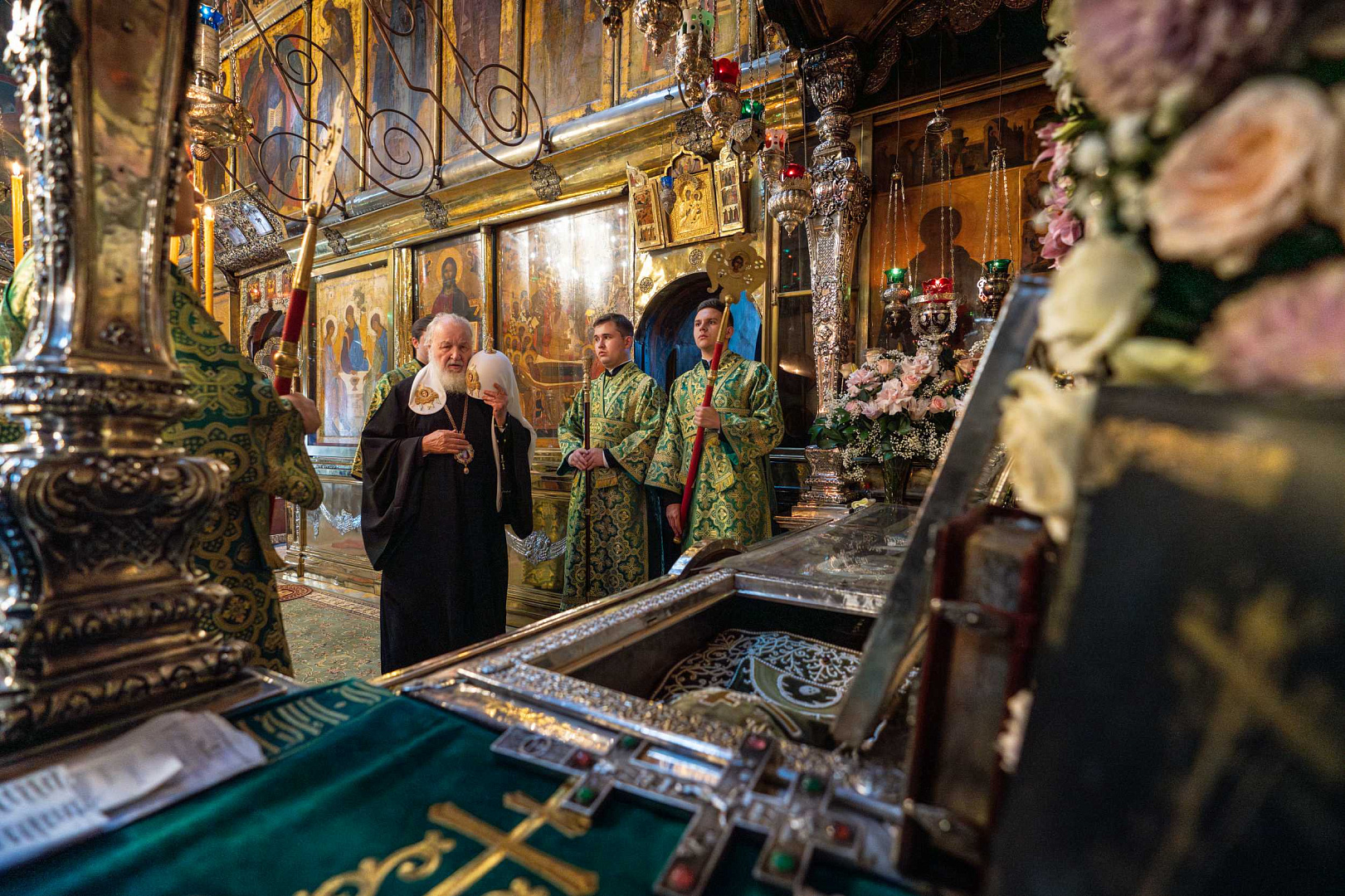 Далее Святейший Патриарх Кирилл проследовал в Троицкий собор, где совершил славление перед мощами преподобного Сергия Радонежского.