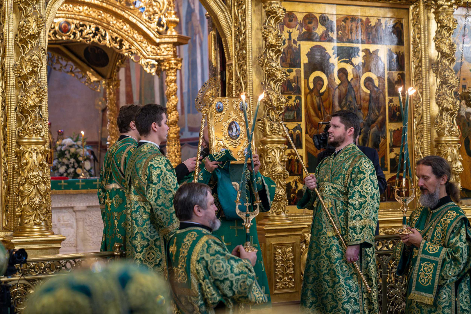 Перед началом богослужения у входа в Успенский собор Предстоятеля Русской Православной Церкви встречали: наместник Свято-Троицкой Сергиевой лавры, ректор Московской духовной академии епископ Сергиево-Посадский и Дмитровский Кирилл; насельник Троице-Сергиевой лавры архимандрит Макарий (Веретенников); секретарь Патриарха Московского и всея Руси по г. Москве протопресвитер Владимир Диваков; глава Сергиево-Посадского городского округа Московской области О.В. Ероханова.