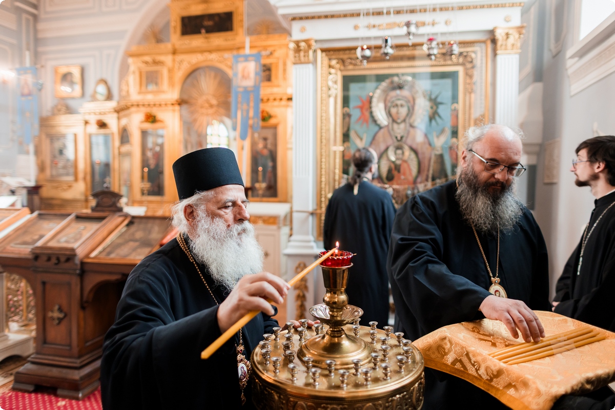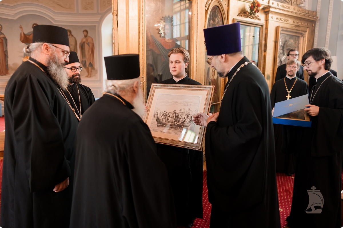 На солее академического храма апостола и евангелиста Иоанна Богослова заведующий международным отделом Санкт-Петербургской духовной академии протоиерей Димитрий Сизоненко вручил гостям памятные подарки – образ небесного покровителя этой духовной школы и гравюру с изображением перенесения мощей святого благоверного князя Александра Невского в Санкт-Петербург.