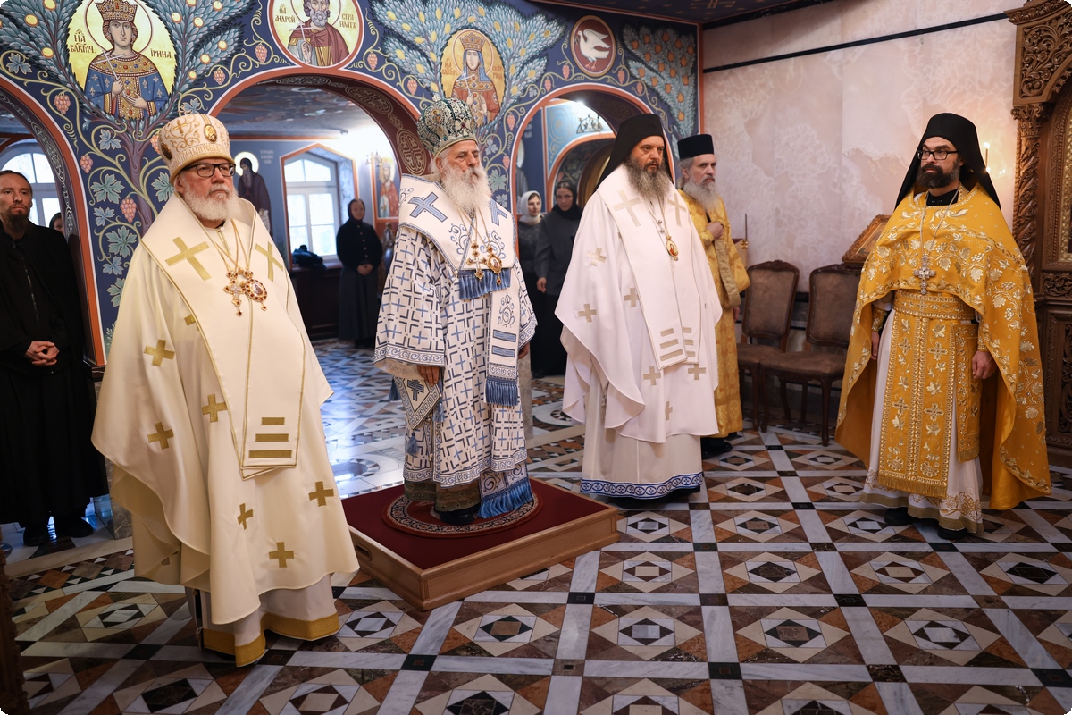 Утро 16 октября началось с совершения соборной архиерейской Литургии в храме равноапостольных Кирилла и Мефодия паломнического дома «Славянский», которую возглавил митрополит Петр в сослужении епископов Панкратия и Николая. За богослужением на заупокойной ектении были помянуты приснопамятный архимандрит Мефодий, трудами которого и был устроен сей храм, а также его родители – Кирилл и Слободка.