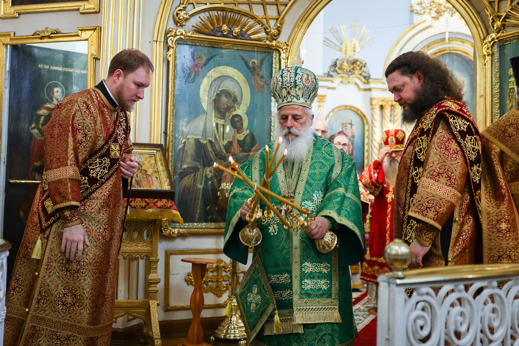 Утро 16 октября началось с совершения соборной архиерейской Литургии в храме равноапостольных Кирилла и Мефодия паломнического дома «Славянский», которую возглавил митрополит Петр в сослужении епископов Панкратия и Николая. За богослужением на заупокойной ектении были помянуты приснопамятный архимандрит Мефодий, трудами которого и был устроен сей храм, а также его родители Кирилл и Слободка.