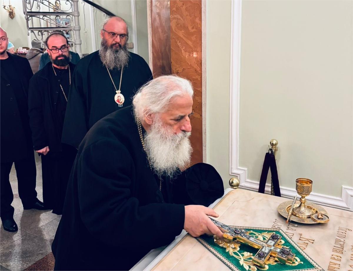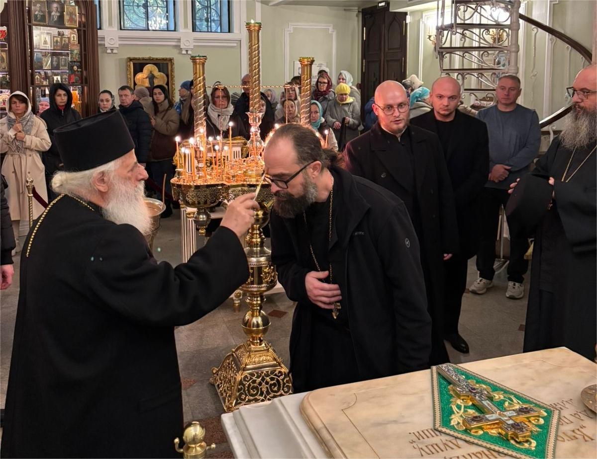 Было совершено славление у мощей священноисповедника Михаила Союзова, память которого праздновалась в этот день.