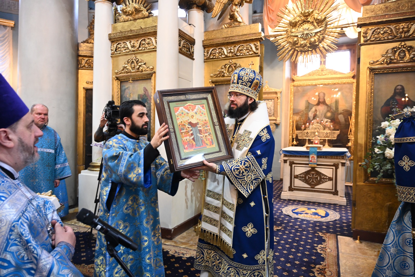 Протоиерей Игорь Выжанов обратился к митрополиту Волоколамскому Антонию со словами приветствия, поблагодарив за посещение храма и совершение богослужения в этот праздничный для прихода день. Настоятель преподнес владыке икону Пресвятой Богородицы «Всех скорбящих Радость».