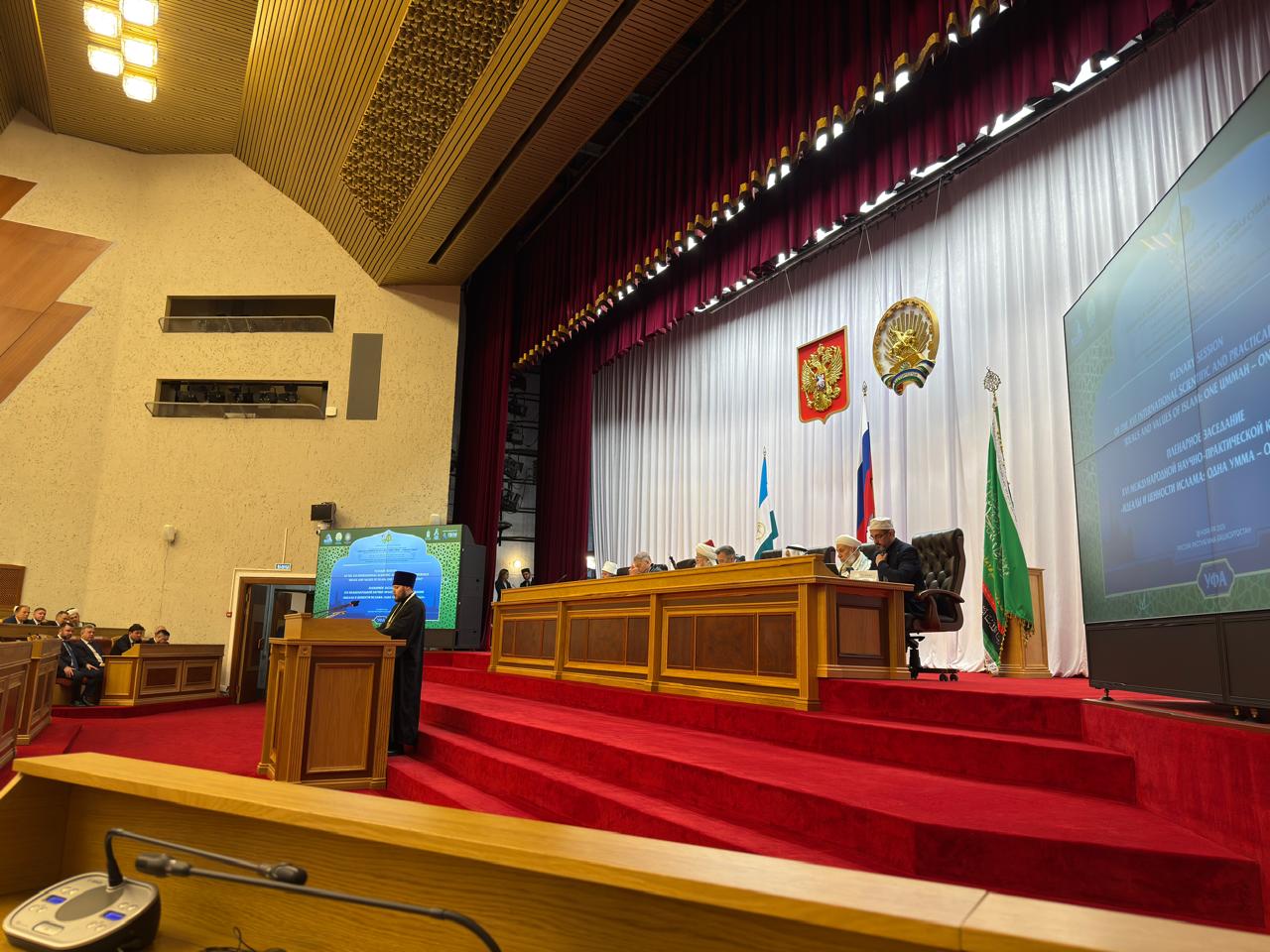В пленарном заседании конференции, которое прошло в здании Государственного собрания – Курултая Республики Башкортостан, приняли участие: шейх-уль-ислам Талгат Таджуддин, глава Республики Башкортостан Р.Ф. Хабиров, митрополит Никон (Васюков), епископ Уфимский и Башкоростанский Филарет, председатель Духовного управления мусульман Татарстана муфтий Камиль Самигуллин, министр по делам вакуфов Египта д-р Осама Аль-Азхари, председатель Духовного управления мусульман Азиатской части России муфтий Нафигулла Аширов, заместитель начальника Департамента по взаимодействию с религиозными организациями Управления Президента по внутренней политике А.Р. Файзуллин, председатель Духовного управления мусульман Северной Осетии муфтий Хаджимурат Гацалов, руководитель Фонда поддержки исламской культуры, науки и образования М.А. Грязнов, доцент Казанской православной духовной семинарии иеромонах Роман (Модин), другие религиозные, государственные и общественные деятели из различных регионов России, Египта, Турции, Ирана, Бахрейна, Иордании, Кыргызстана, Таджикистана, Казахстана, Узбекистана и других стран.