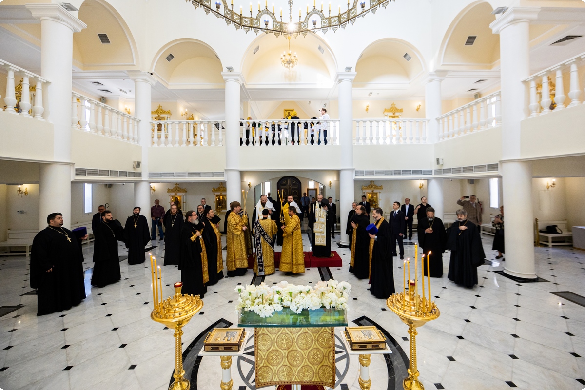 Перед началом работы круглого стола митрополит Волоколамский Антоний, митрополит Каирский и Северо-Африканский Константин и епископ Луховицкий Евфимий в сослужении участников круглого стола совершили молебен перед началом всякого доброго дела в храме святого апостола Филиппа в Шардже.