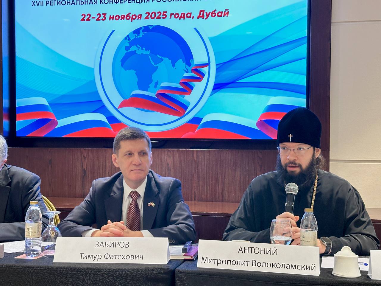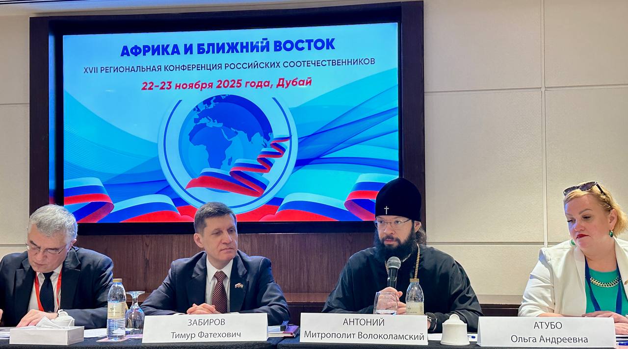 Служба коммуникации ОВЦС, 22.11.2025. 22 ноября 2025 года в Дубае (ОАЭ) состоялось открытие XVII региональной конференции российских соотечественников стран Африки и Ближнего Востока, в работе которой приняла участие делегация Московского Патриархата во главе с председателем Отдела внешних церковных связей Московского Патриархата митрополитом Волоколамским Антонием. Для участия в форуме прибыли представители организаций российских соотечественников из африканского и ближневосточного регионов.