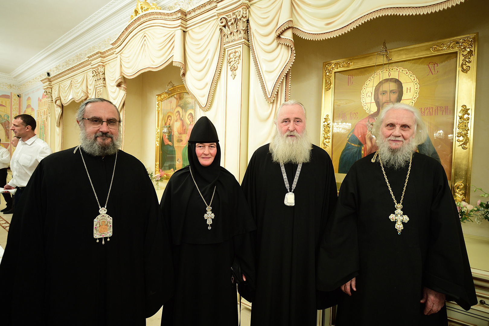 Затем игумения Феофания тепло приветствовала архипастырей и поблагодарила их за совершенное богослужение. На память о посещении обители матушка Феофания преподнесла епископу Димитрию икону блаженной Матроны Московской, пожелав, чтобы ее молитвами Господь утешил страдающий сирийский народ.