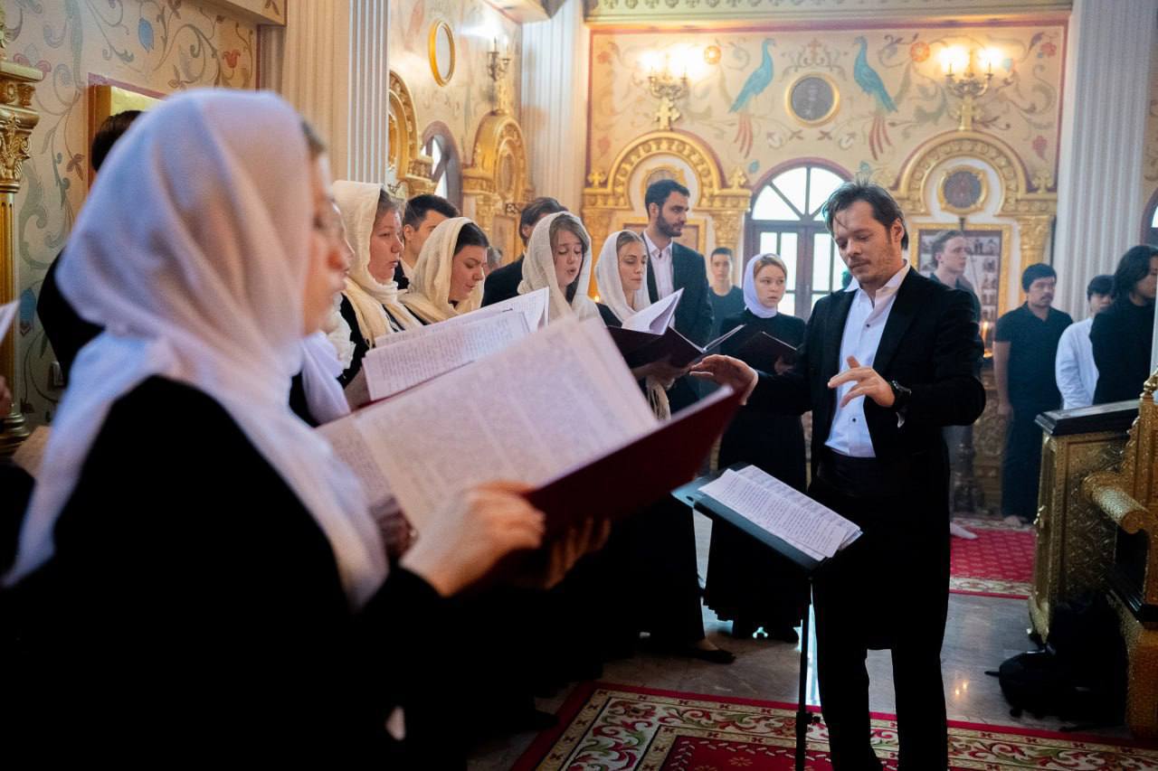 Песнопения Божественной литургии исполнил Московский Синодальный хор под управлением главного хормейстера и композитора Михаила Котельникова.