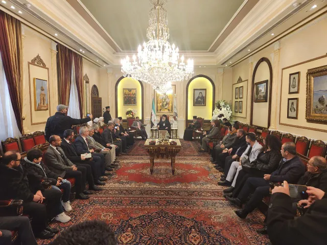 Служба коммуникации ОВЦС, 27.12.2025. 25 декабря, в день празднования Рождества Христова по новоюлианскому календарю, в Тронном зале Антиохийской Патриархии Блаженнейший Патриарх Великой Антиохии и всего Востока Иоанн X принял традиционное поздравление с этим великим праздником от викарных епископов, духовенства и мирян приходов града Дамаска.
