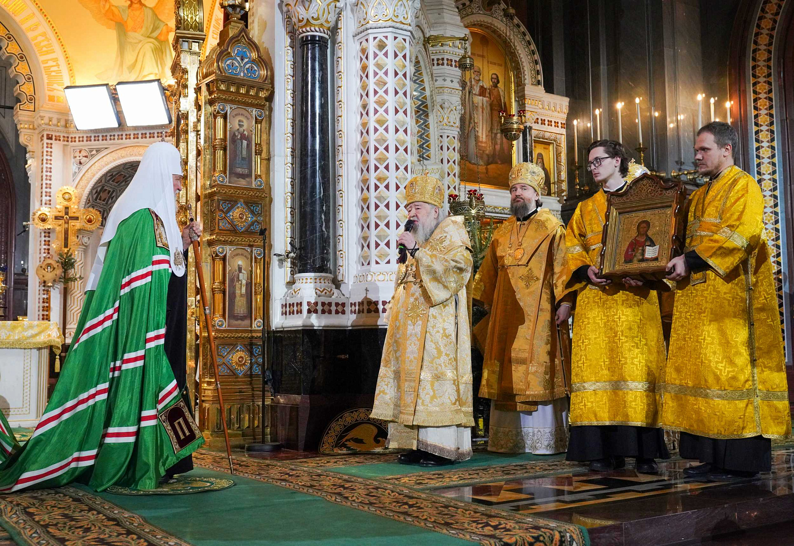 Евангельское зачало было прочитано Предстоятелем Русской Православной Церкви по старинному напрестольному Евангелию времен императрицы Елизаветы Петровны, которое выносится из алтаря Храма Христа Спасителя дважды в год: на Рождественскую и Пасхальную великую вечерни.