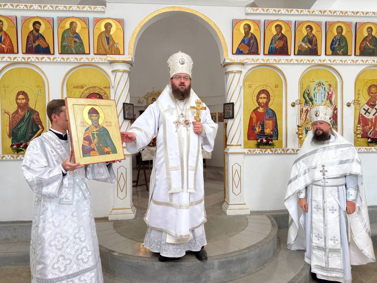 Владыка подарил протоиерею Димитрию наперсный крест, а храму – икону святого благоверного князя Ярослава Мудрого. Отец Димитрий преподнес архиерею панагию.
