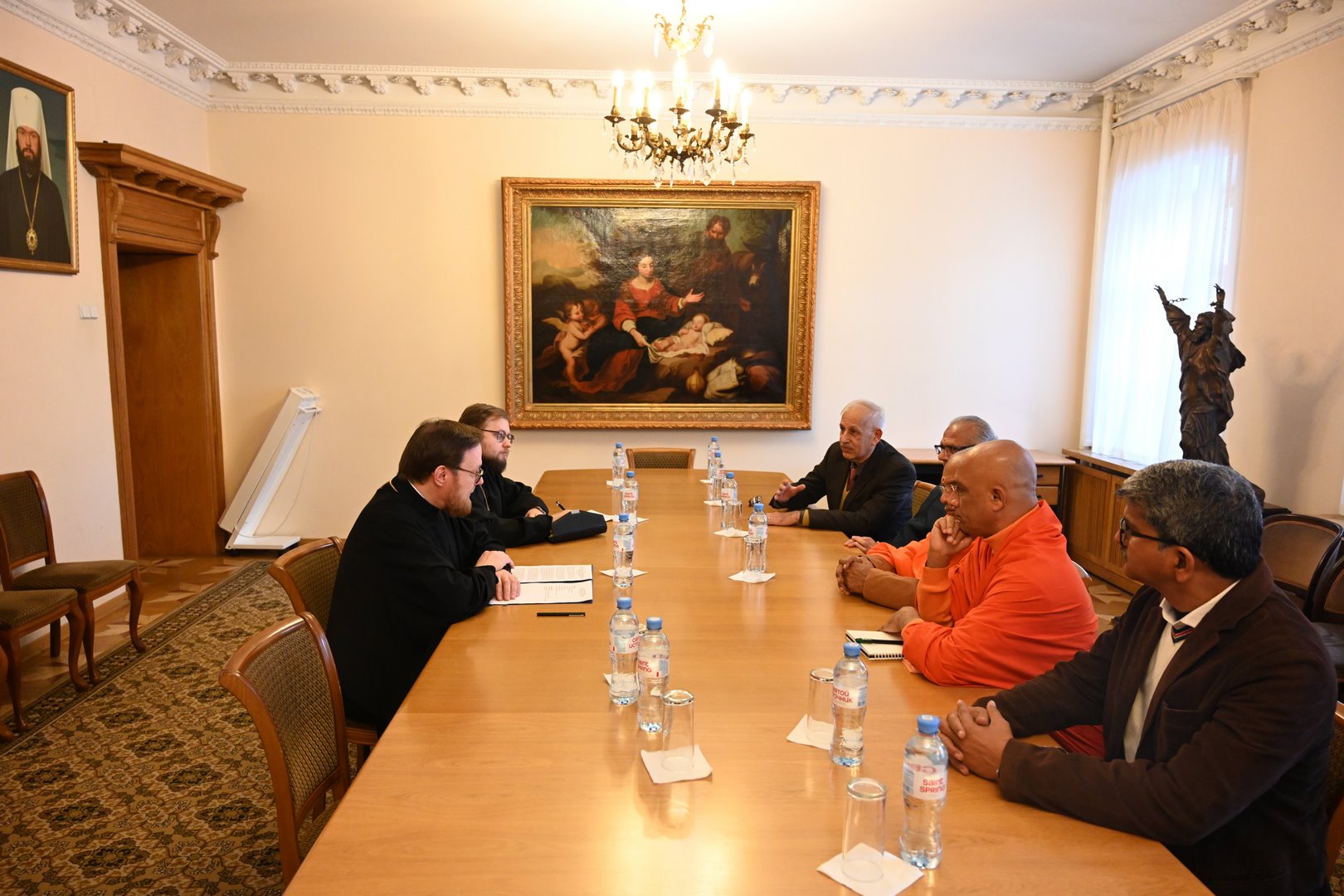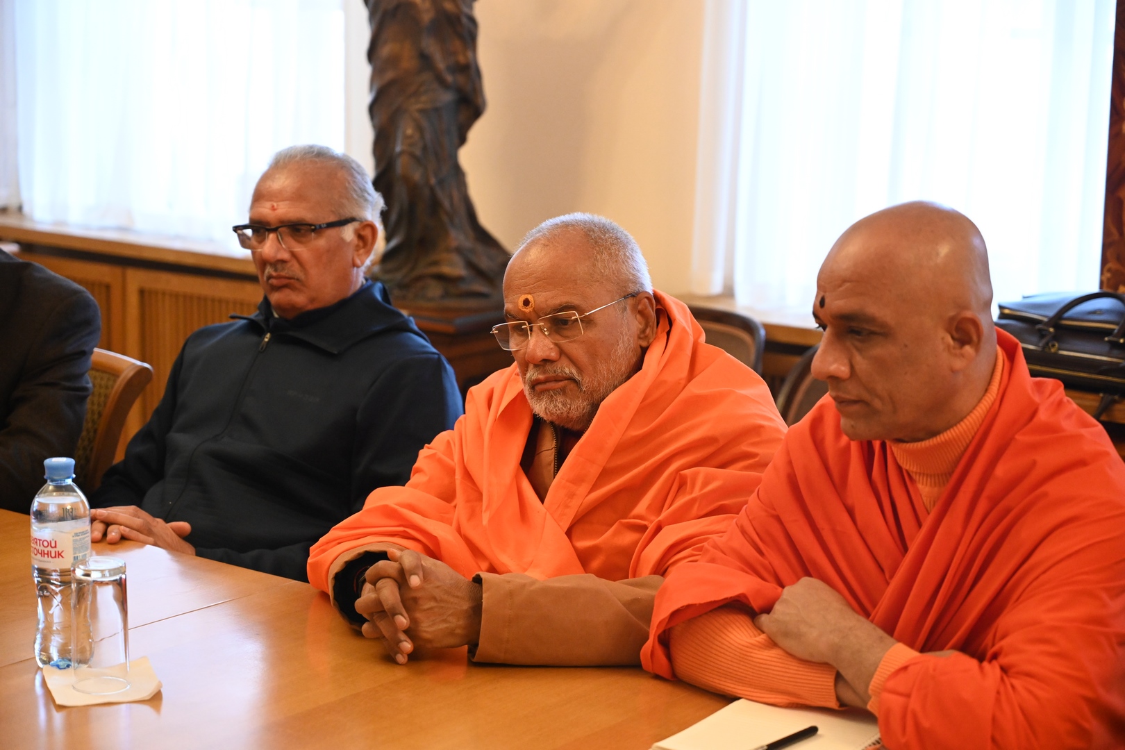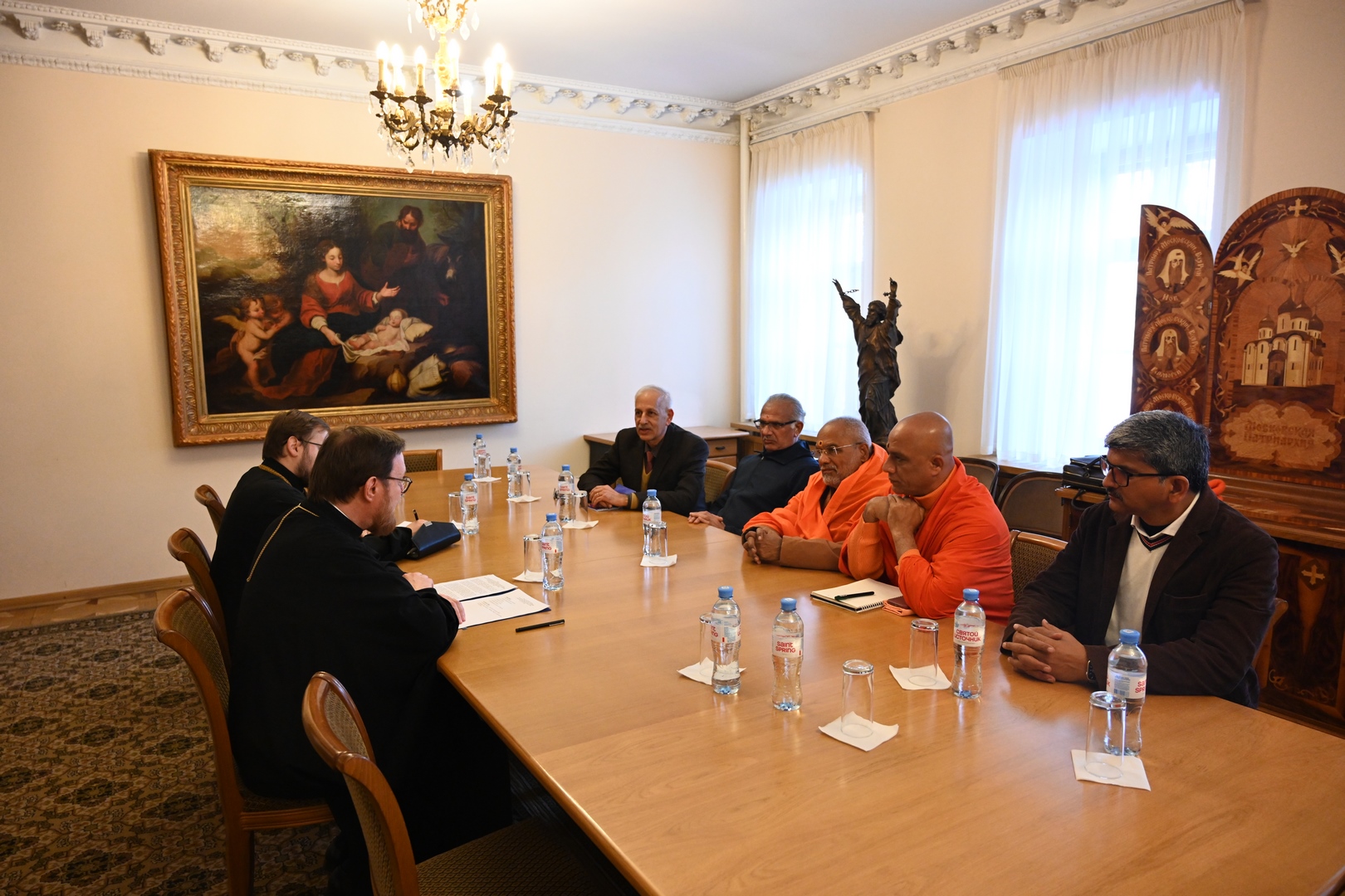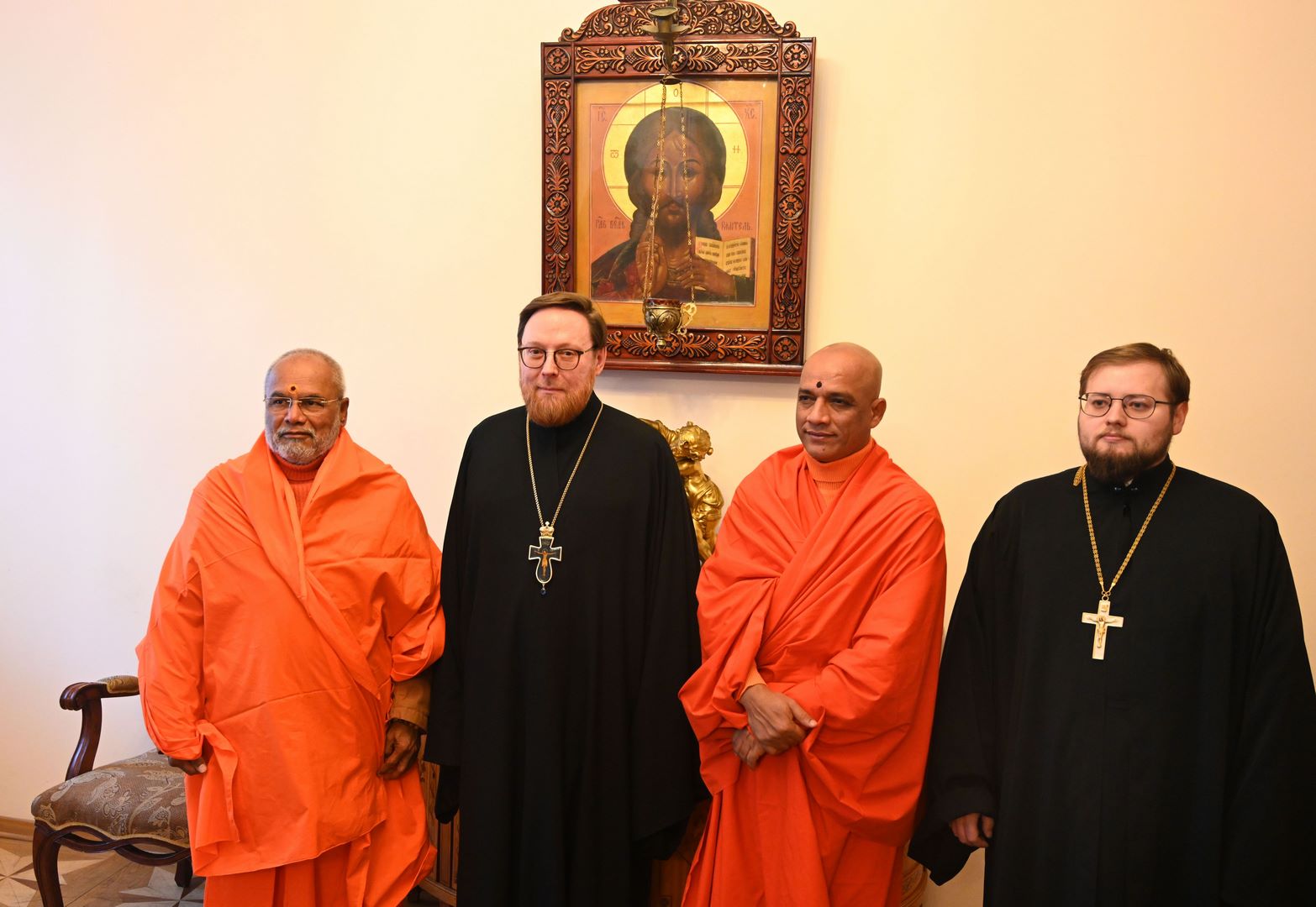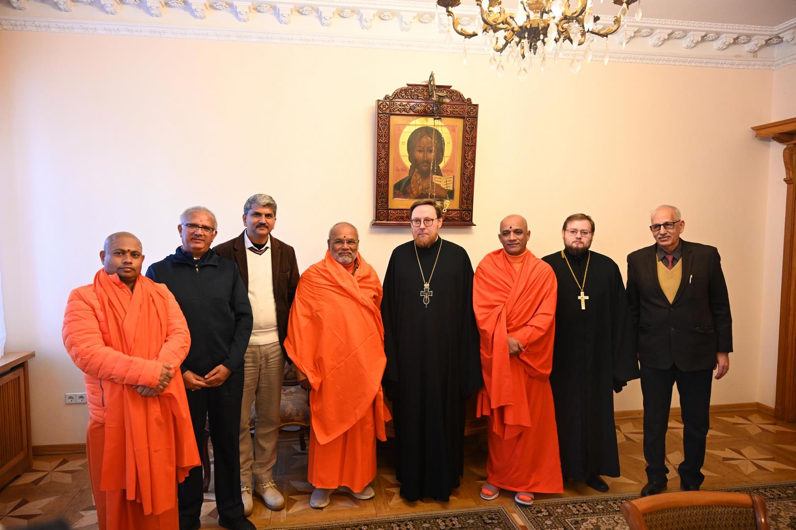 Служба коммуникации ОВЦС, 26.01.2026. 26 января в Отделе внешних церковных связей Московского Патриархата состоялась встреча заместителя председателя ОВЦС архимандрита Филарета (Булекова) с делегацией религиозных и общественных деятелей, представляющих объединение лидеров различных направлений традиционного индуизма Hindu Dharma Acharya Sabha. В состав делегации вошли: Свами Парматмананда Сарасвати; Свамиджи Нирмалананданатха; Харитсинх Гохил; Гопал Гири Гоусвами; Атул Анеджа; Свамиджи Шришила. Со стороны Отдела внешних церковных связей во встрече также принял участие секретарь ОВЦС по межрелигиозным отношениям иерей Илия Кашицын.
