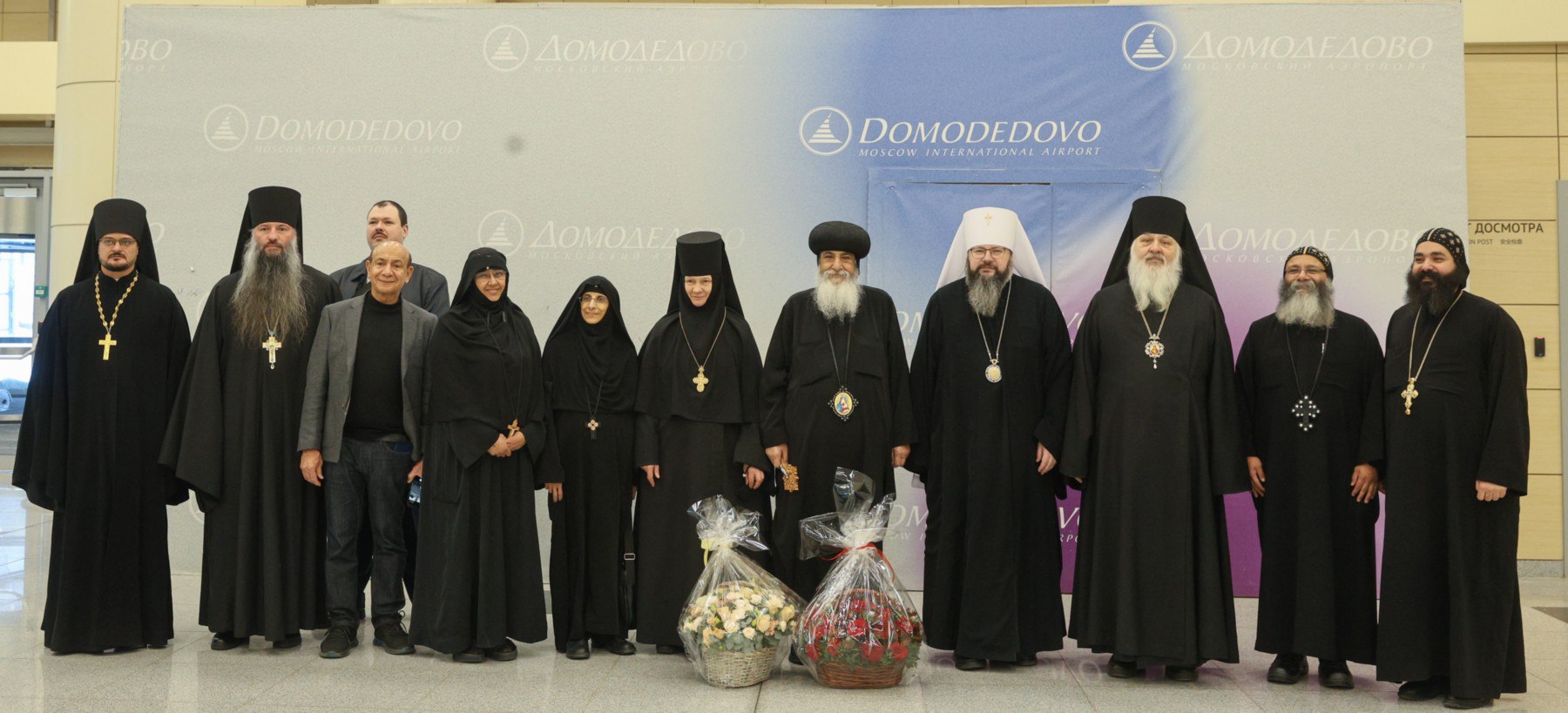 В международном аэропорту «Домодедово» гостей встречали: сопредседатель Комиссии по диалогу между Русской Православной Церковью и Коптской Церковью митрополит Смоленский и Дорогобужский Исидор; викарий Святейшего Патриарха Московского и всея Руси, наместник Екатерининского ставропигиального мужского монастыря епископ Видновский Тихон; настоятельница Зачатьевского ставропигиального женского монастыря города Москвы, заместитель председателя Синодального отдела по монастырям и монашеству Русской Православной Церкви игумения Иулиания (Каледа); секретарь Отдела внешних церковных связей Московского Патриархата по межхристианским отношениям иеромонах Стефан (Игумнов); настоятель Вознесенской Давидовой пустыни игумен Сергий (Куксов); клирики Смоленской митрополии иерей Лев Гарин и иерей Константин Гарин; сотрудник ОВЦС С.Г. Алферов.