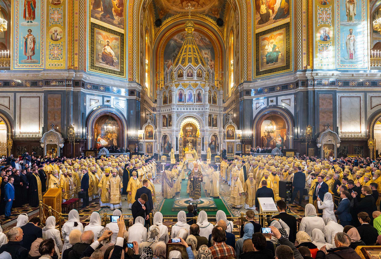 В этот знаменательный день Святейший Патриарх Кирилл совершил Божественную литургию в кафедральном соборном Храме Христа Спасителя в Москве в интронизационных облачениях и с копией жезла святителя Петра.