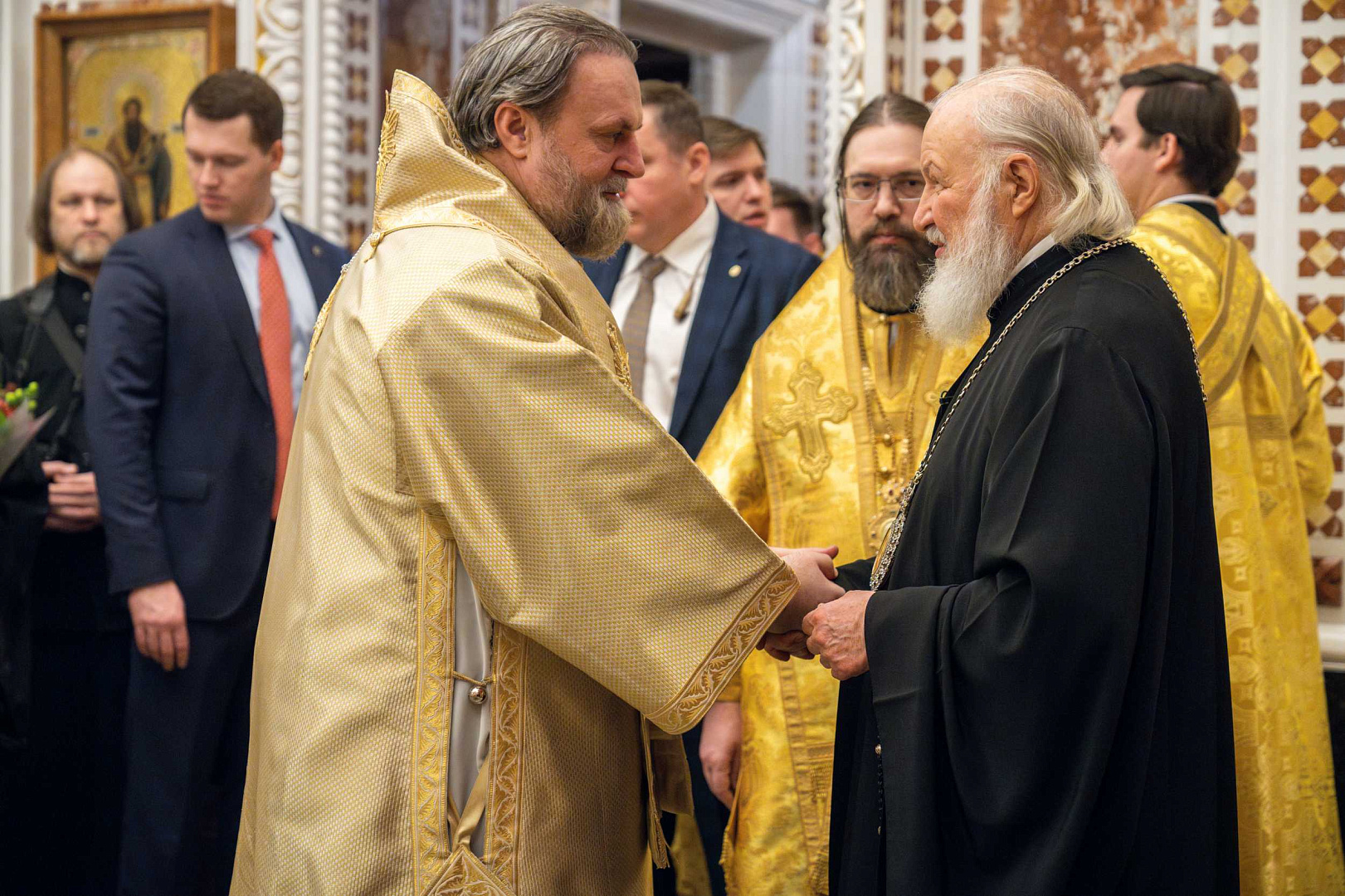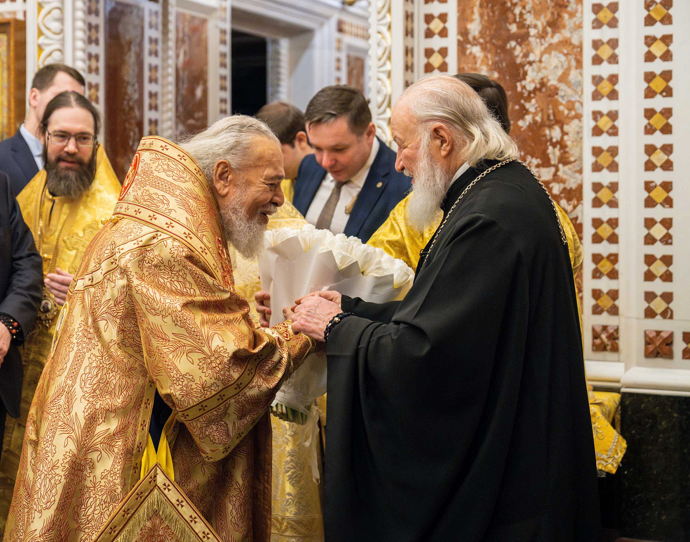 По окончании Литургии после пения «Многолетия», митрополит Воскресенский Григорий огласил поздравительный адрес от членов Священного Синода Русской Православной Церкви Святейшему Патриарху Кириллу с 17-й годовщиной интронизации. В дар Его Святейшеству митрополит Григорий преподнес икону Божией Матери «Одигитрия» и букет белых роз.
