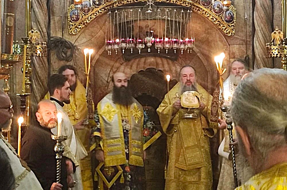 Служба коммуникации ОВЦС, 17.02.2026. 15 февраля, в Неделю мясопустную, о Страшном Суде, и праздник Сретения Господа Бога и Спаса нашего Иисуса Христа, по благословению Блаженнейшего Патриарха Иерусалимского Феофила III старший скевофилакс Гроба Господня архиепископ Иерапольский Исидор (Иерусалимский Патриархат) возглавил ночную Божественную литургию на Гробе Господнем в храме Воскресения Христова в Иерусалиме.