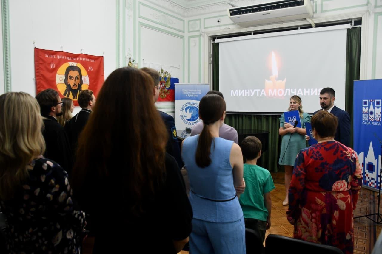 Торжественную часть открыли дети из сводного хора школы при Посольстве Российской Федерации в Аргентинской Республике и Русского дома в Буэнос-Айресе, исполнившие гимн Государственного фонда «Защитники Отечества» «Мощь страны. Сыны Побед!».