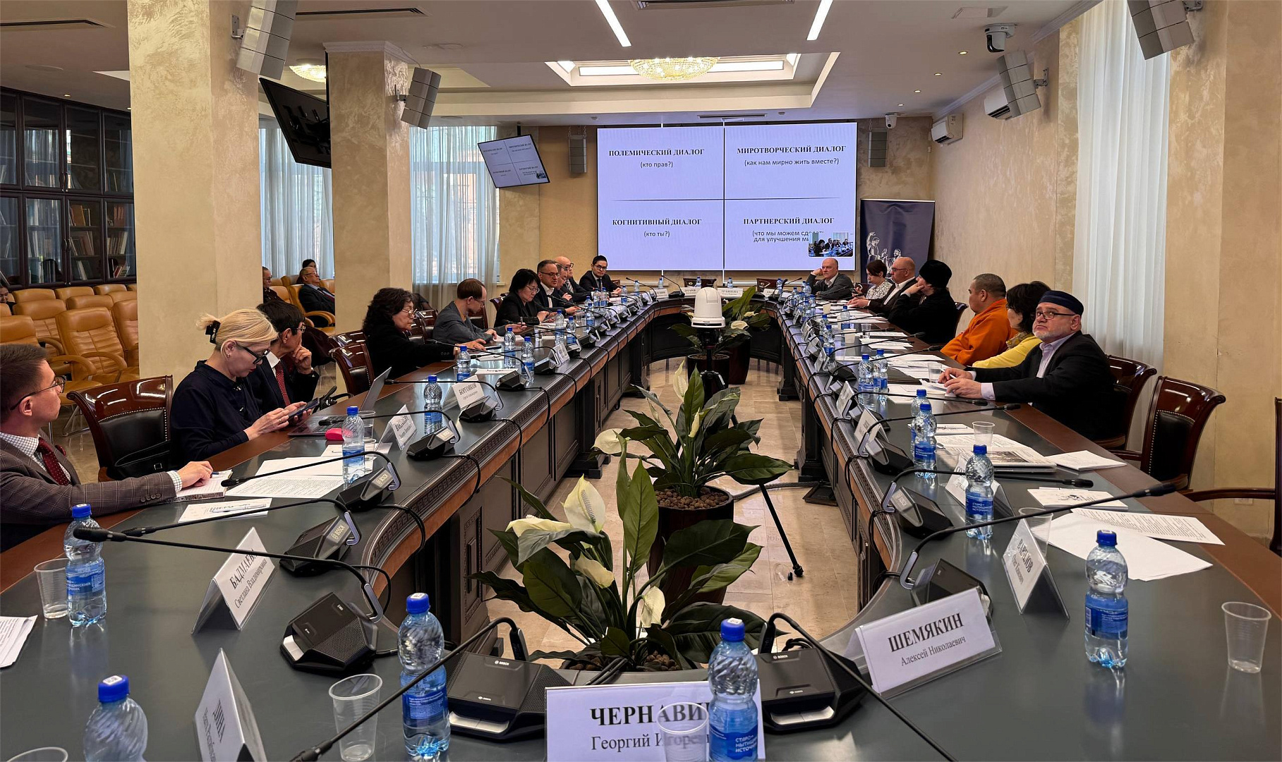 В ходе круглого стола прозвучали выступления председателя комиссии Общественной палаты Российской Федерации по межнациональным, межрелигиозным отношениям и миграции В.Ю. Зорина, начальника Управления государственной политики в сфере межнациональных отношений Федерального агентства по делам национальностей России Т.Г. Цыбикова, Дид Хамбо ламы Буддийской традиционной сангхи России, руководителя постоянного представительства Буддийской традиционной сангхи в городе Москве Даши-Нима В. Содномдоржиева, председателя ЦРО «Международная исламская миссия» Ш.А. Пшихачева, председателя Центрального духовного управления буддистов Геше Йонтена, руководителя Управления по работе с государственными структурами Синодального отдела по взаимоотношениям Церкви с обществом и СМИ Московского Патриархата П.В. Лебедева, руководителя Департамента образования и науки Духовного управления мусульман РФ И.К. Давлетшина, ведущего научного сотрудника Института научной информации по общественным наукам Российской академии наук С.В. Мельникова, секретаря попечительского комитета Межрелигиозного совета России О.В. Блюдова и других.