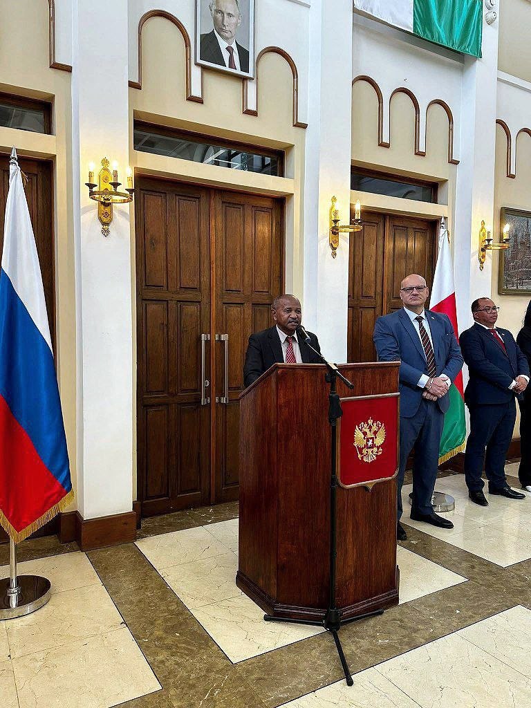 Церемония прошла в посольстве Российской Федерации в Республике Мадагаскар. Она собрала более 70 гостей, среди которых были и клирики Русской Православной Церкви на Мадагаскаре: благочинный Северного и клирик Южного церковных округов Мадагаскара иерей Василий Рандрианайву и иерей Алексий Эризу.