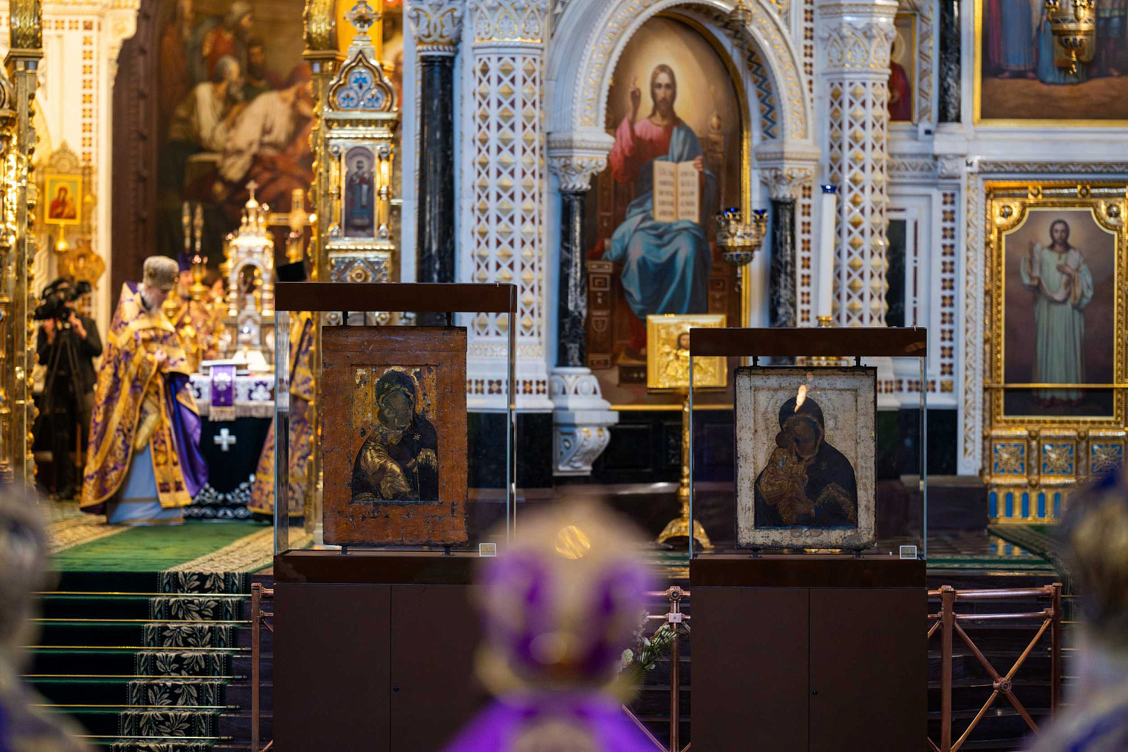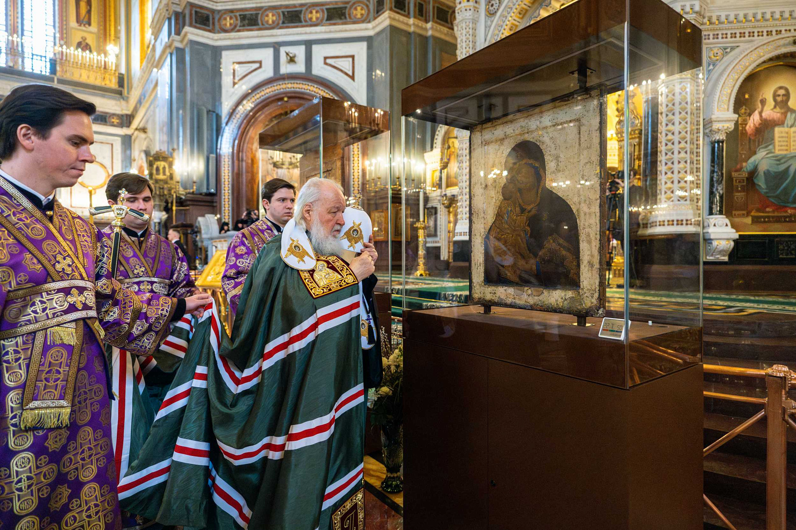 По прибытии в Храм Христа Спасителя Предстоятель Русской Православной Церкви поклонился чудотворным Владимирской и Донской иконам Божией Матери и честным мощам святителя Филарета, митрополита Московского, сообщает Пресс-служба Патриарха.