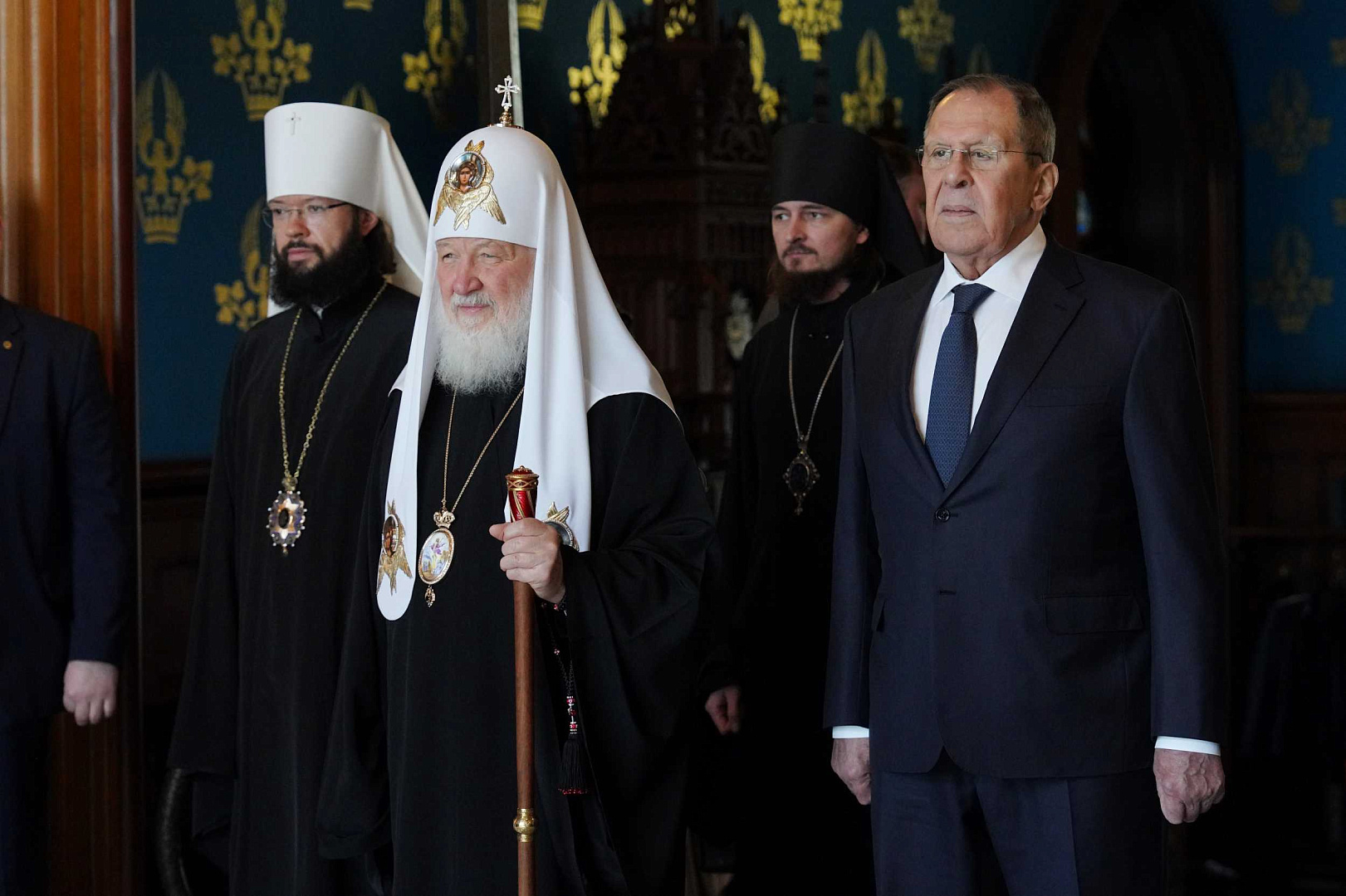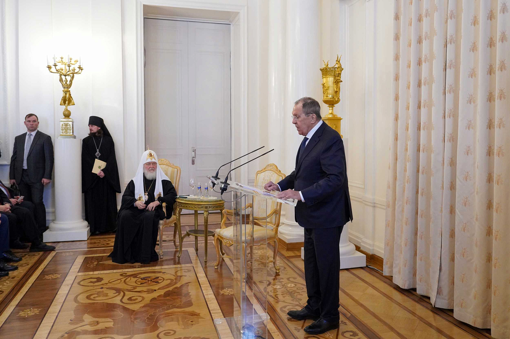 На праздничной встрече присутствовал Святейший Патриарх Московский и всея Руси Кирилл. Предстоятеля Русской Православной Церкви встречал министр иностранных дел Российской Федерации С.В. Лавров.