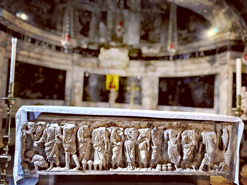 Престол-саркофаг в крипте датируется началом IV века. Он был возведен над могилой святой. Согласно преданию, ее ученики – первые христиане в этом городе – погребли праведную Марфу в доме, где она жила, и здесь же были совершены первые христианские богослужения.