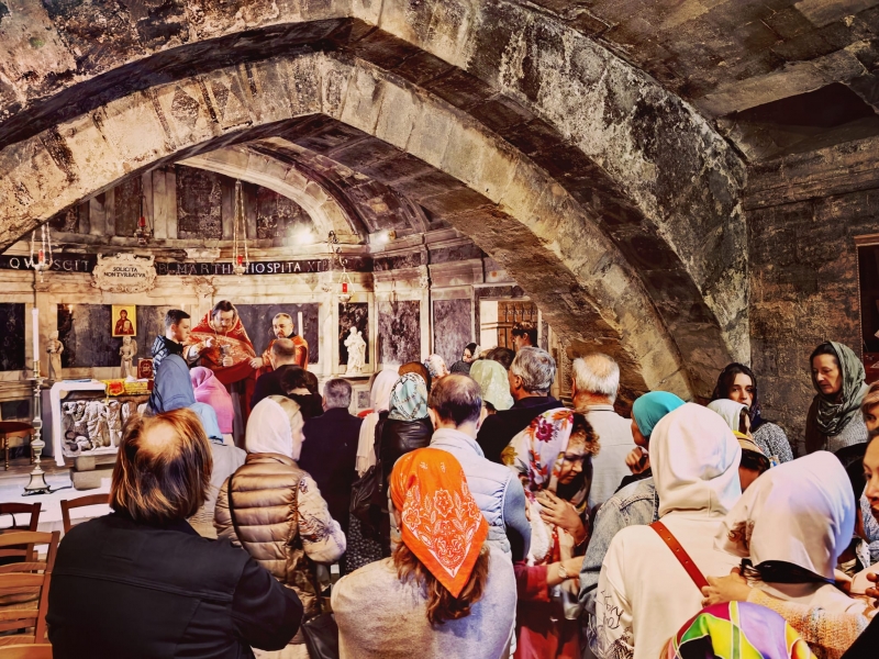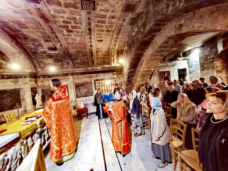 Божественная литургия была совершена в крипте католического храма в честь святой Марфы, где находится наиболее древний престол храма, которым служит сама гробница (мраморный саркофаг) жены-мироносицы.